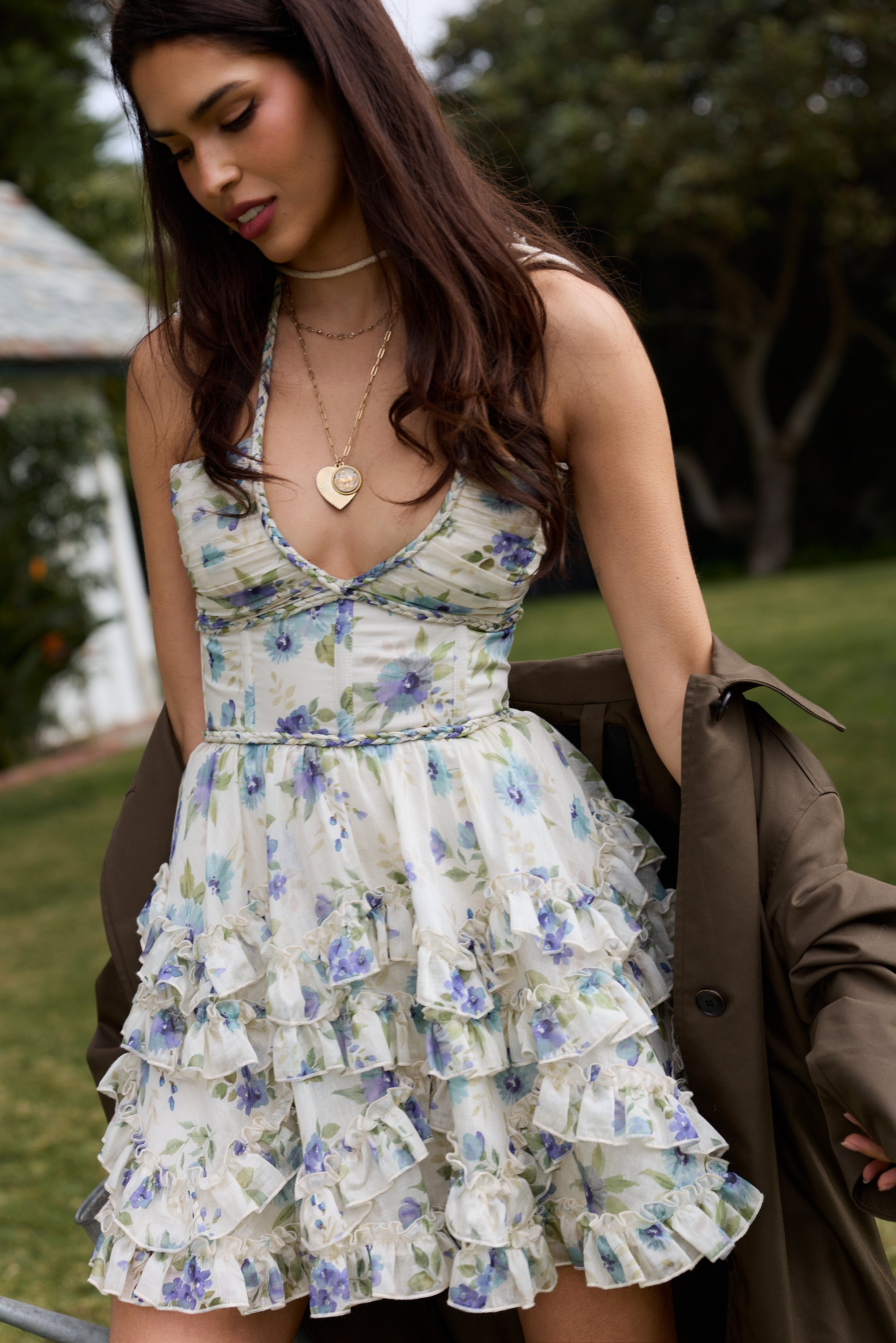 Meet Sophie! She is a gorgeous halter mini dress. She features a stunning corset bodice, beautifully gathered skirt with zigzag and straight rows of delicate ruffle details, and an invisible zipper. She is made in our stunning Blue Watercolor Floral linen, which features blue and teal florals on a cream background, and is oh so very sweet!