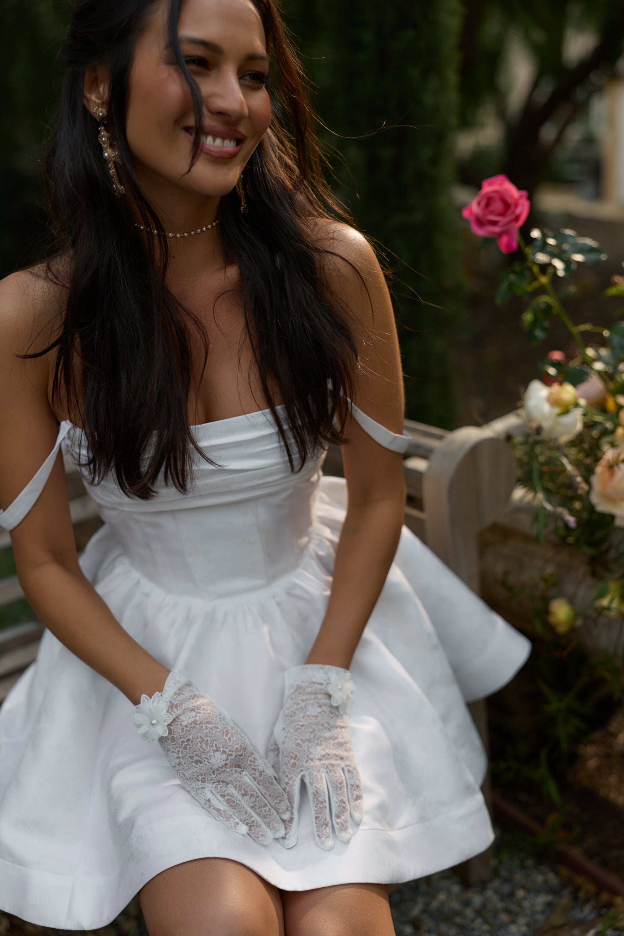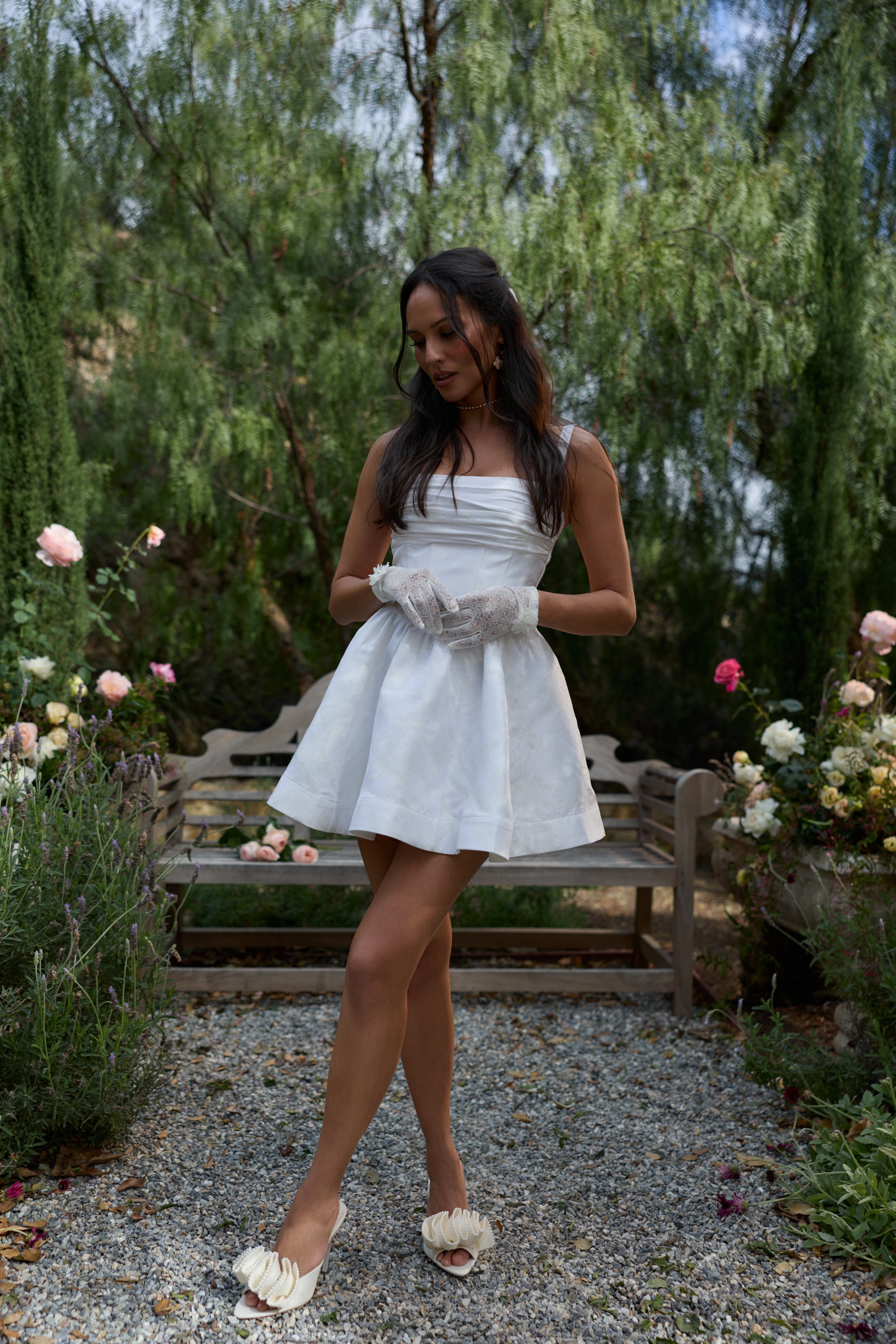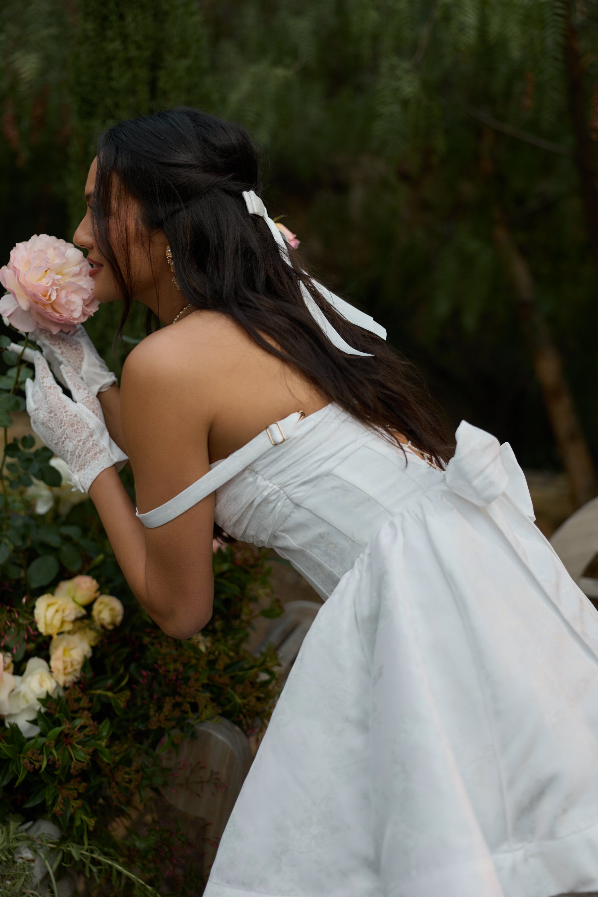 The Addison Dress in White Windsor Brocade is oh so romantic. Designed with a basque waistline, this corset mini dress features a beautiful gathered bust, a delicate bow, and pockets. Made in our White Windsor Brocade, which features white florals on a white background, she flaunts a full gathered skirt that adds playful movement and charm. Remove the removable straps for versatile styling. Addison feels both classic and romantic, and she's oh so perfect for bridal events, garden parties, or any movement worth celebrating.