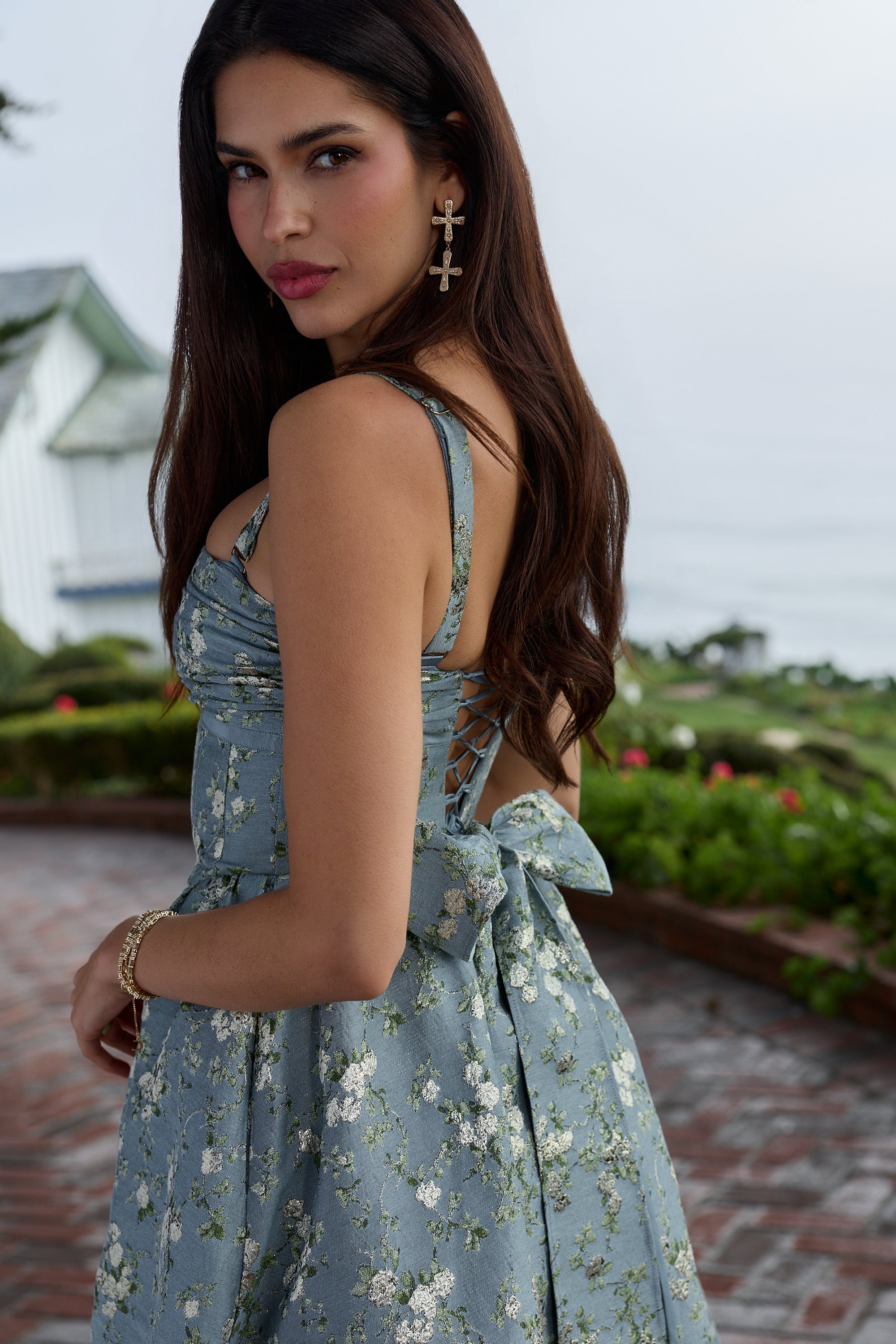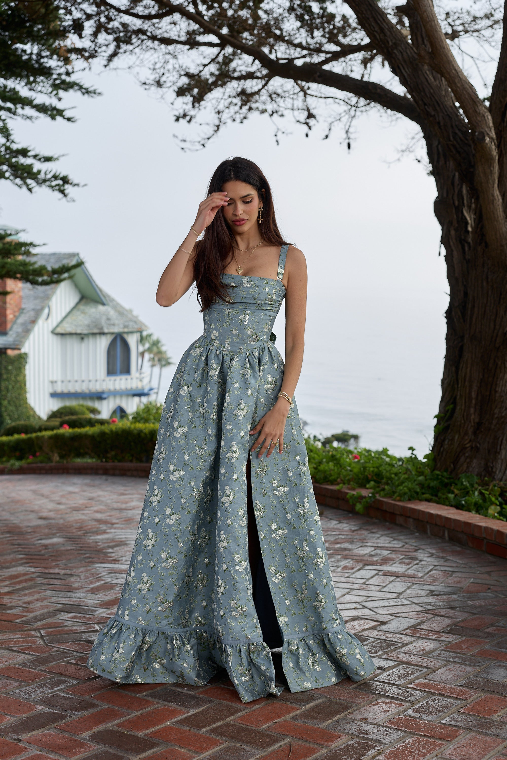 Meet Ava! She's a stunning floor-length gown with a basque waistline. She's made from our romantic Slate Blue Cheverny, which features champagne florals on a slate blue background. Fall in love with a beautiful gathered empire bust, a flirty side-front slit, and center lace-up closure. Remove the detachable wide shoulder straps for a strapless moment in this beauty!