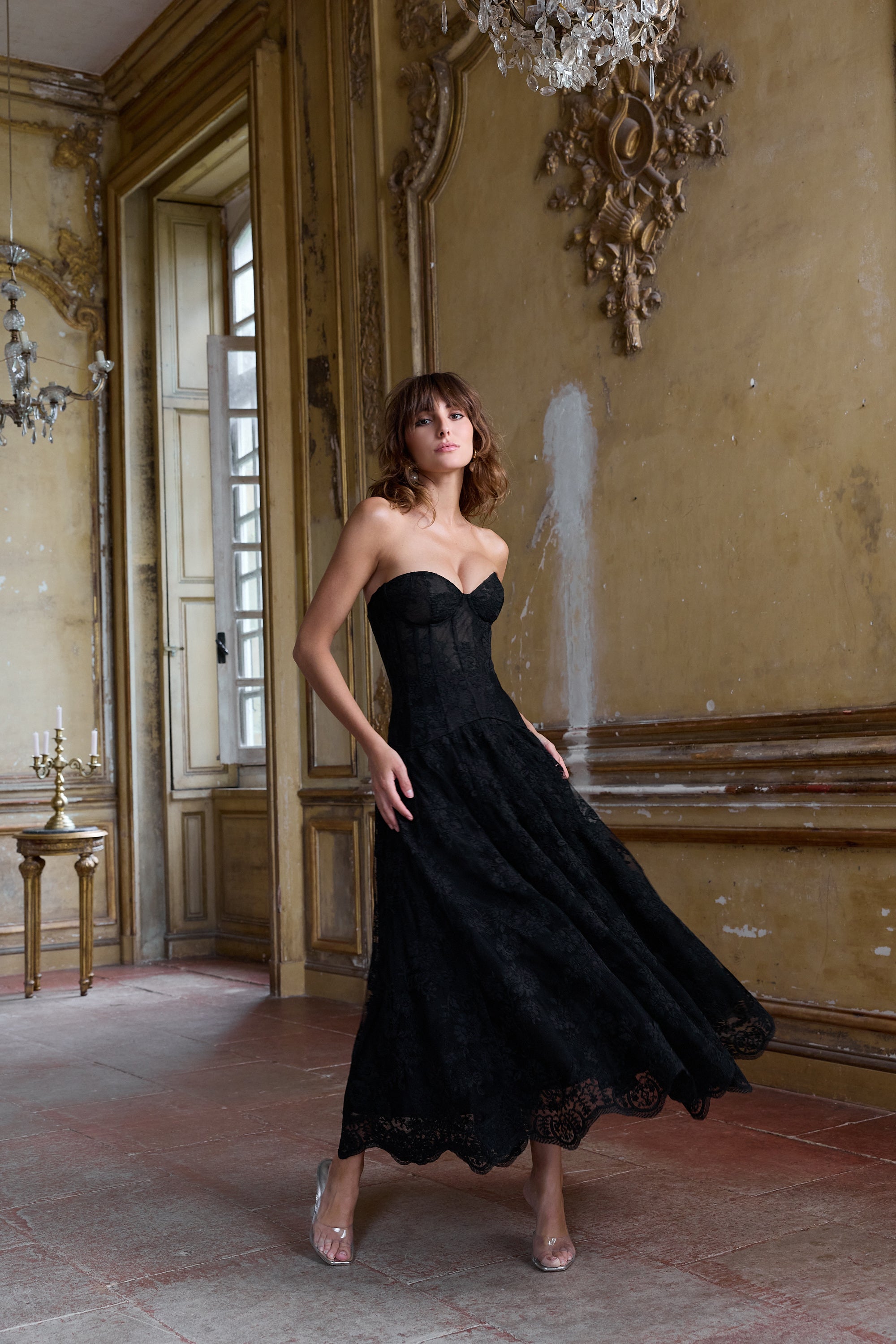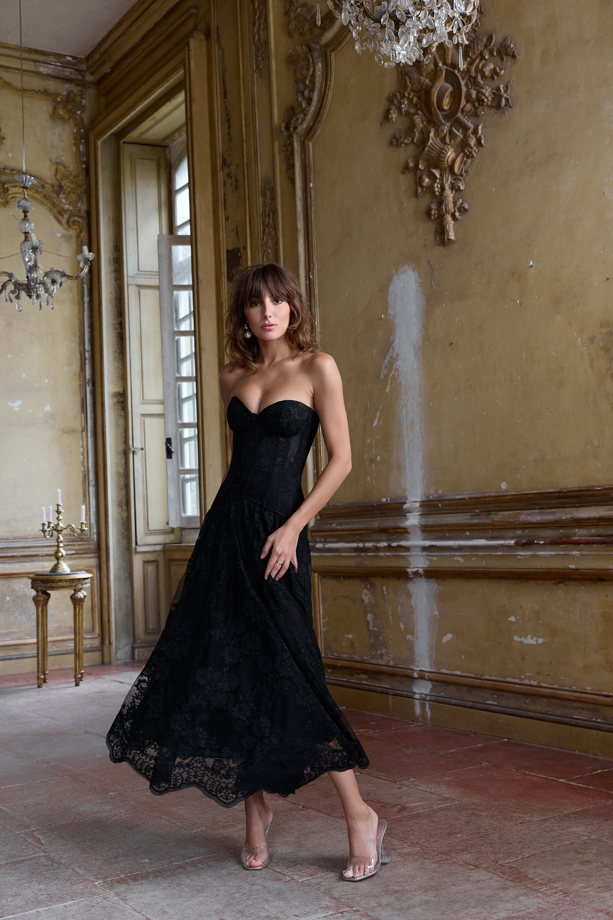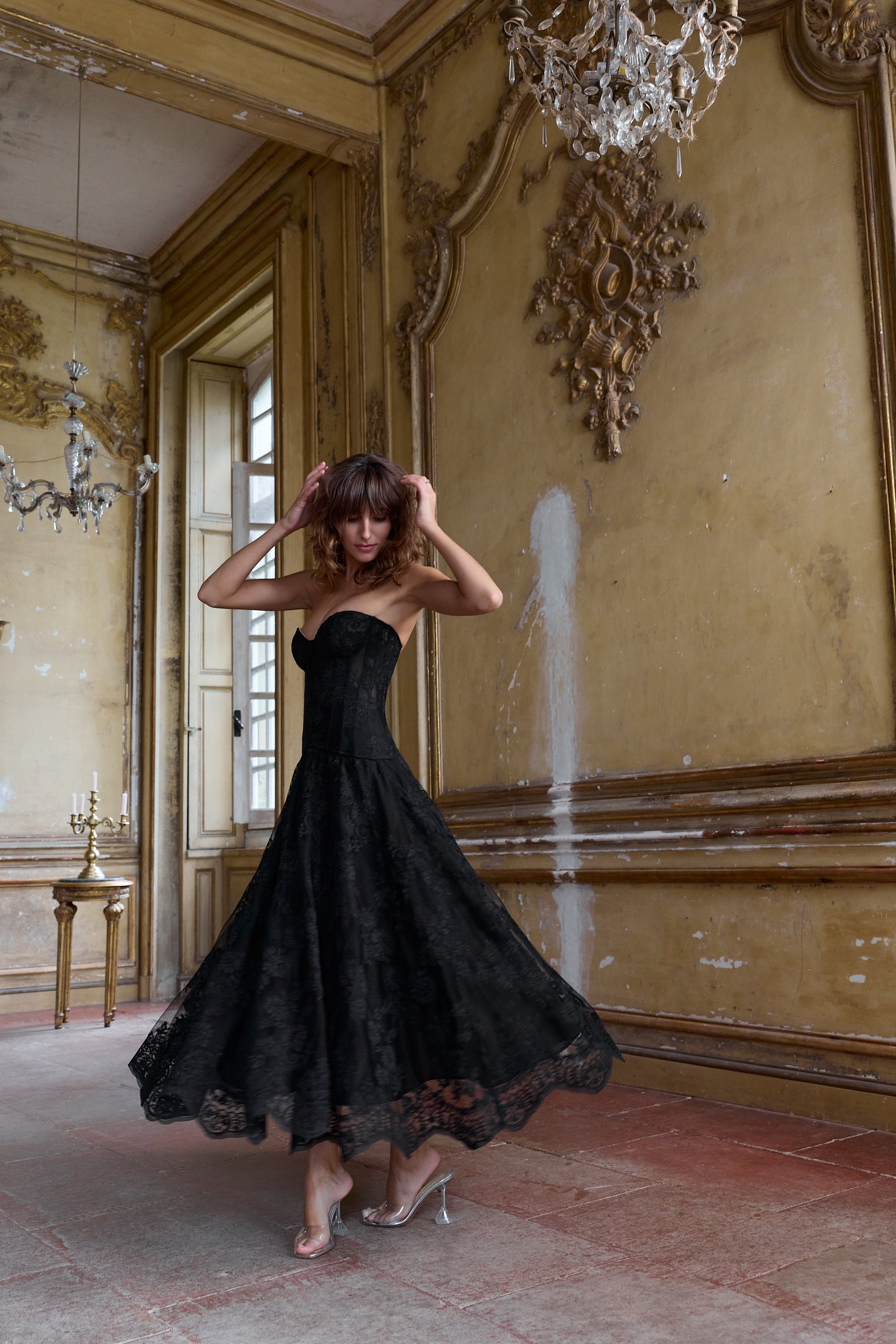 Meet Carolena, the set of your dreams! She's a delicate top and skirt set adorned with hand-corded lace. Her top features a sweetheart neckline, fully boned bodice, and a beautifully laced corset back with a dropped waist. Her skirt flaunts a bias A-line circle-skirt with an invisible zipper. Made from our embroidered Black Chantilly Lace, she features paisley-lace with mesh backing. Frolic through all your moments in this beauty!