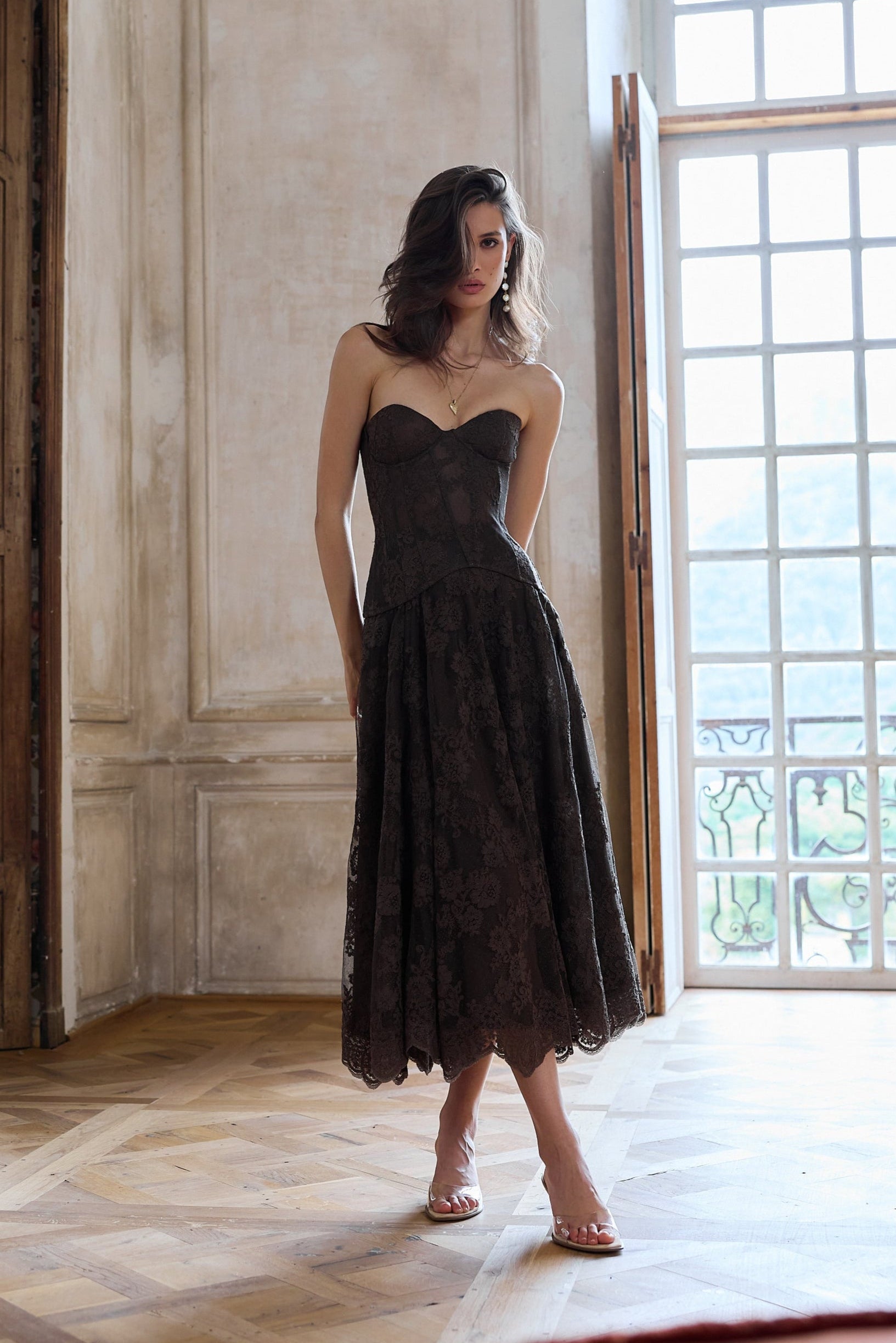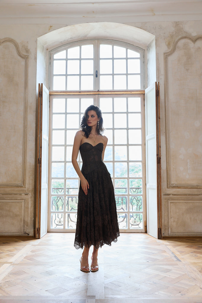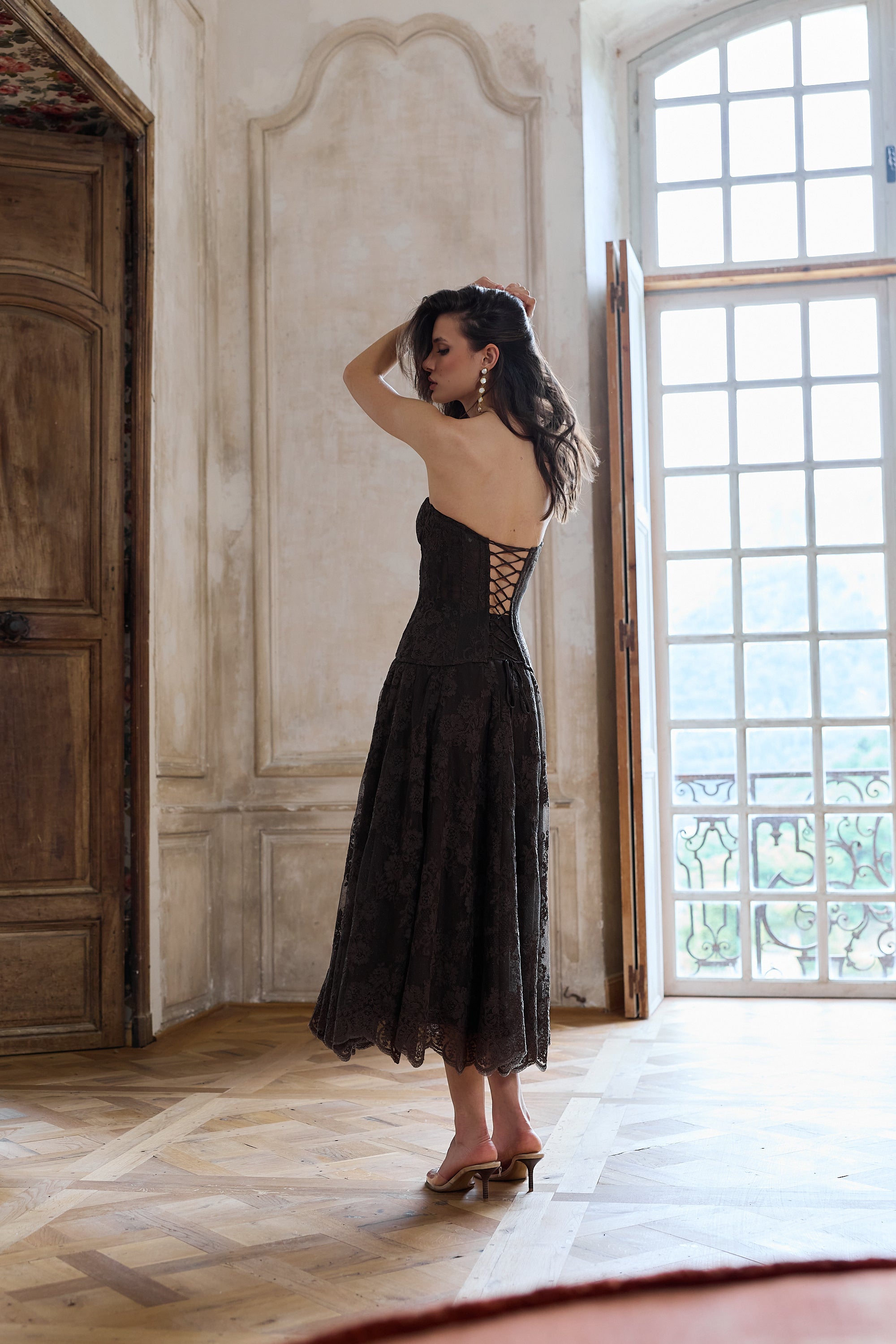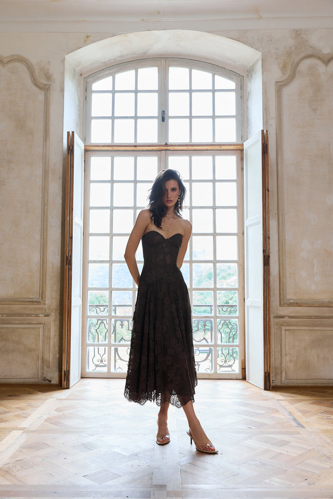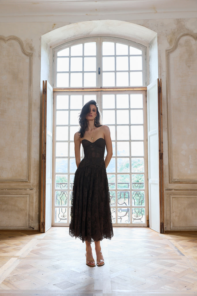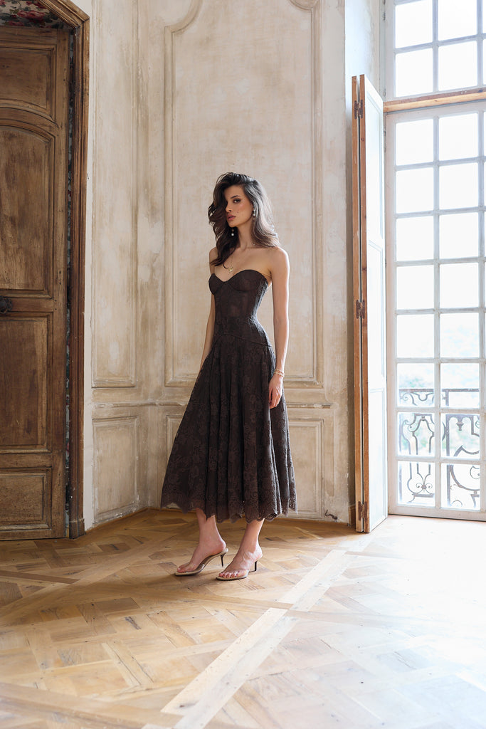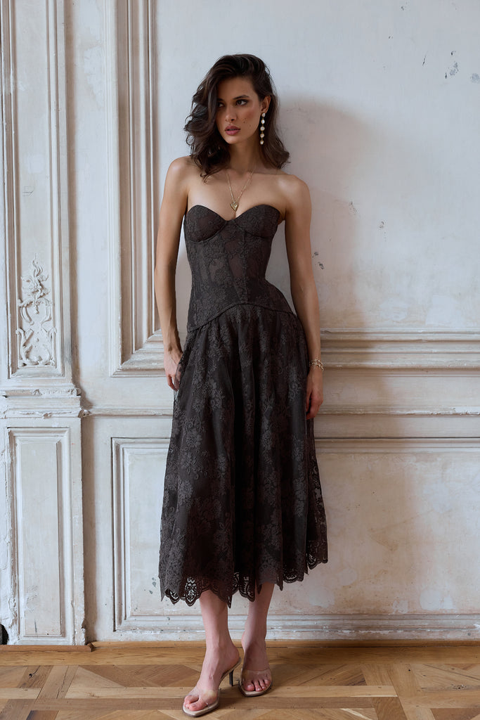 Meet Carolena, the set of your dreams! She's a delicate top and skirt set adorned with hand-corded lace. Her top features a sweetheart neckline, fully boned bodice, and a beautifully laced corset back with a dropped waist. Her skirt flaunts a bias A-line circle-skirt with an invisible zipper. Made from our embroidered Chocolate Chantilly Lace, she features paisley-lace with mesh backing. Frolic through all your moments in this beauty!