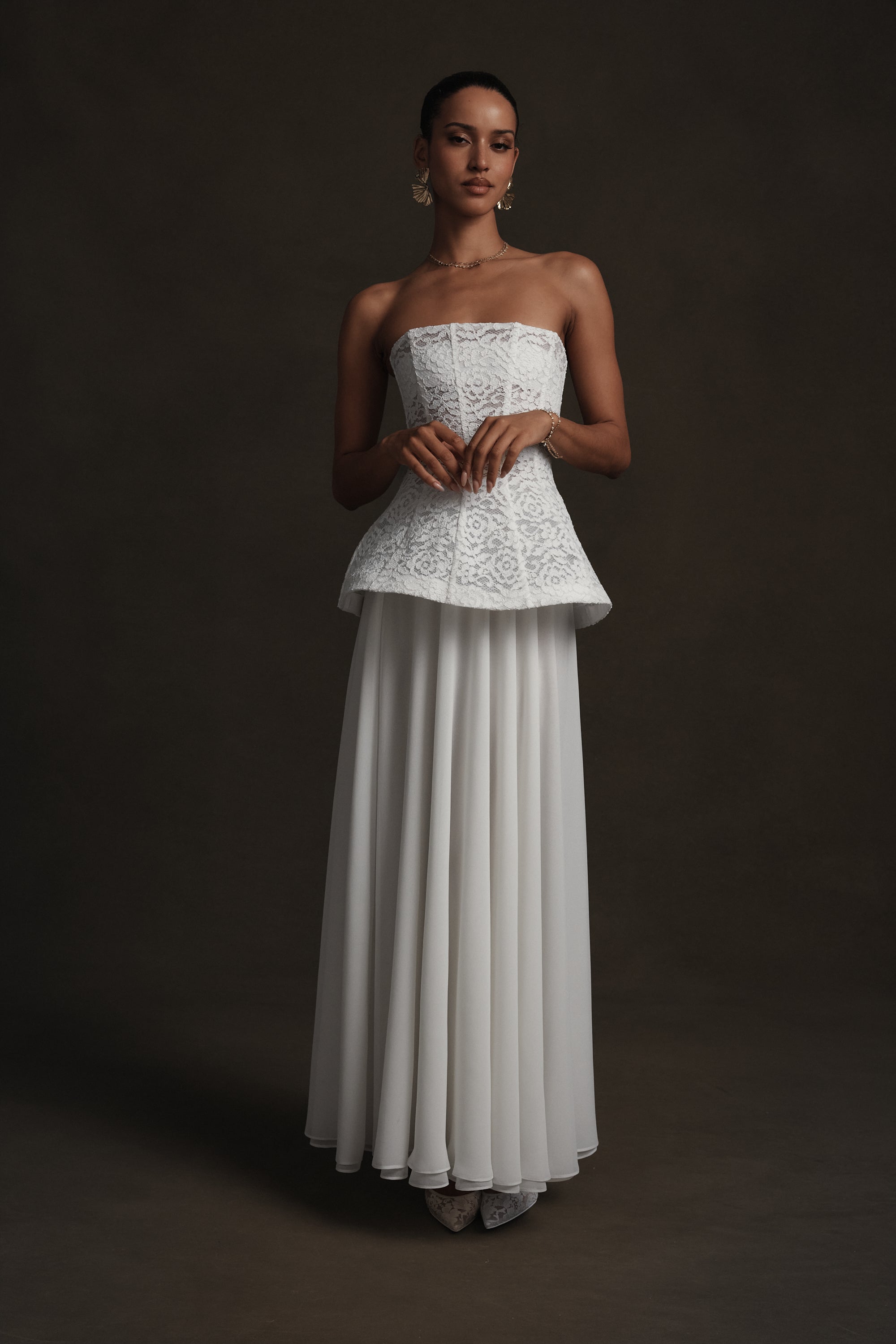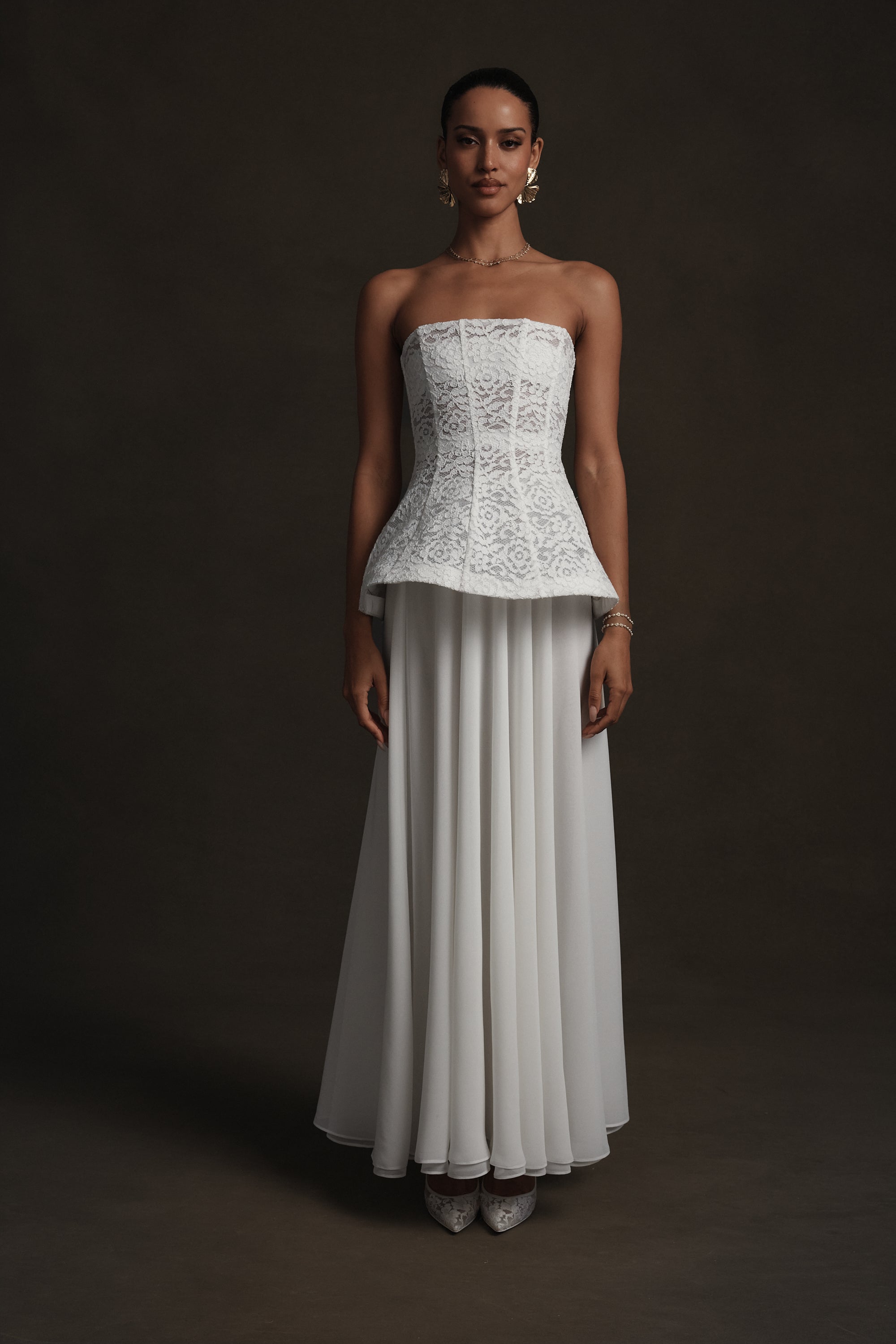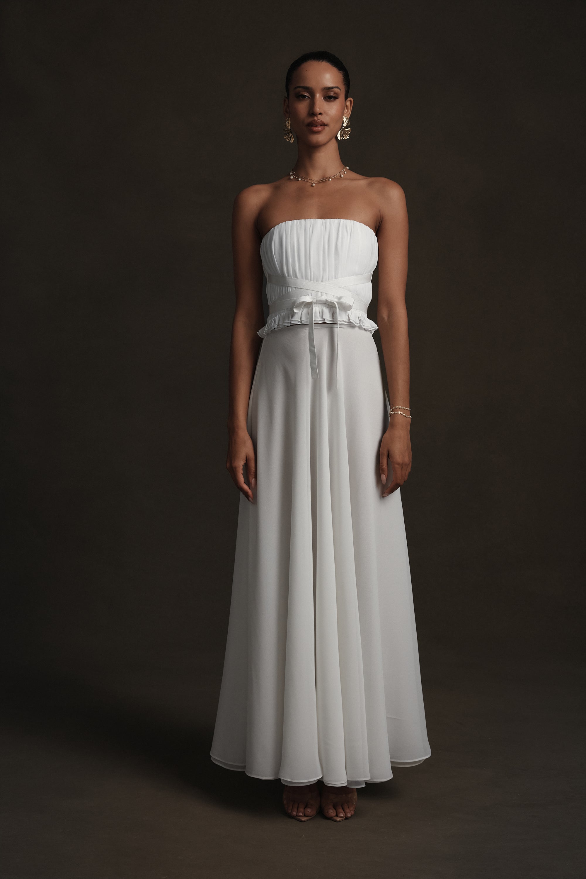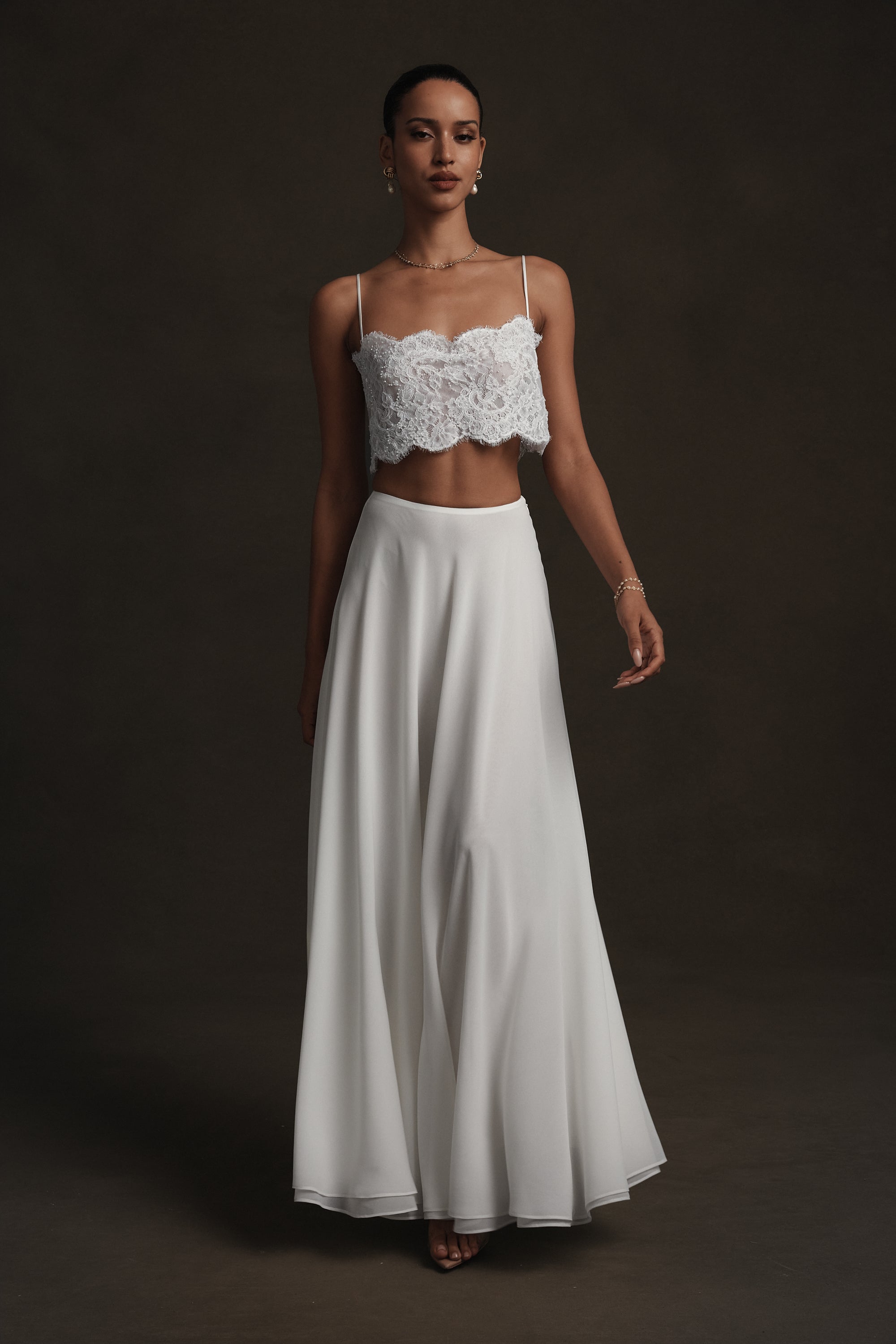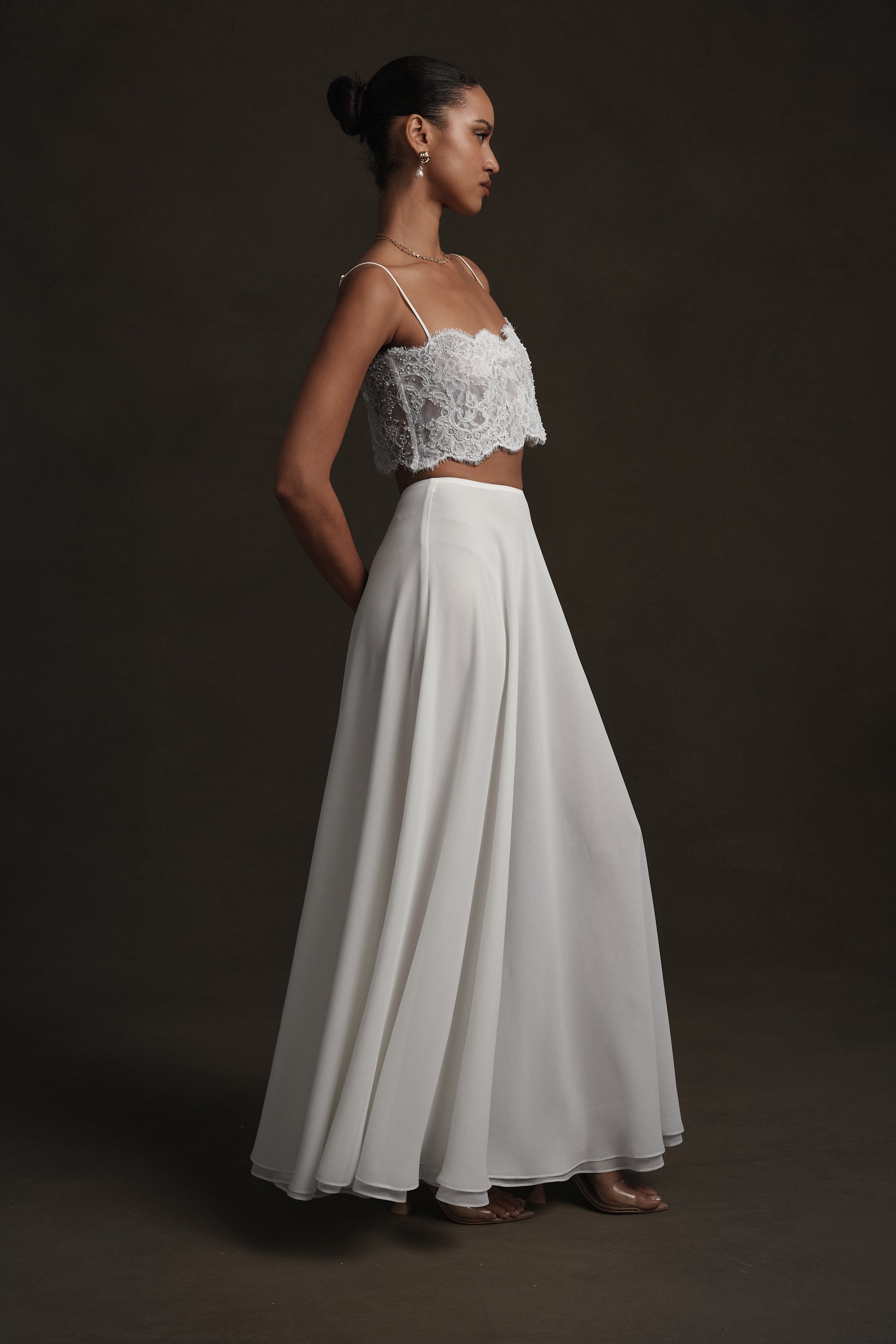 The Carter Skirt is a high-waisted, floor-length bias cut skirt. Crafted in semi-sheer white chiffon, it features soft vertical seaming that enhances its elegant movement and elongating shape. Light and airy with a graceful flow, pair Carter with The Rebecca Top for an ethereal, polished look.