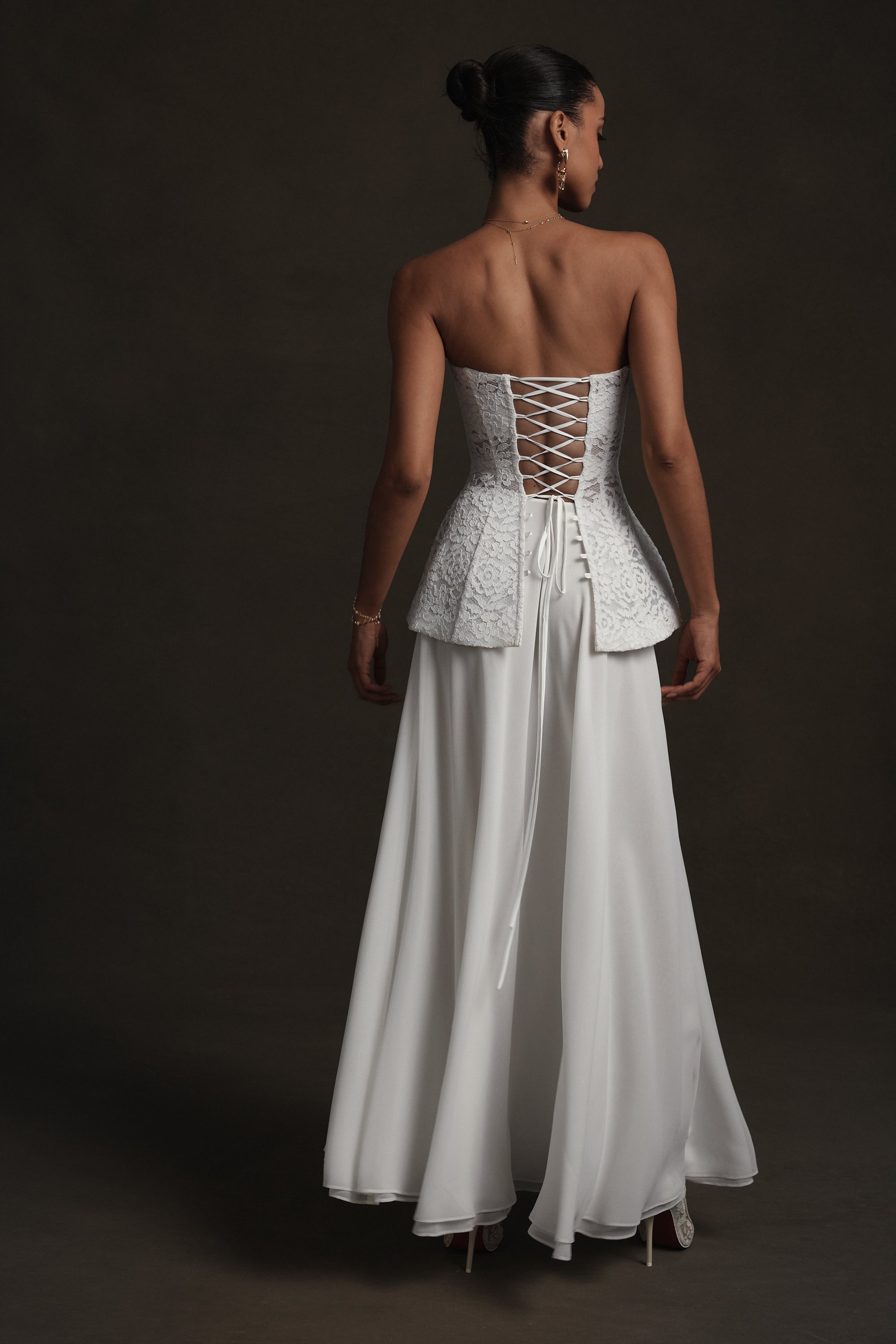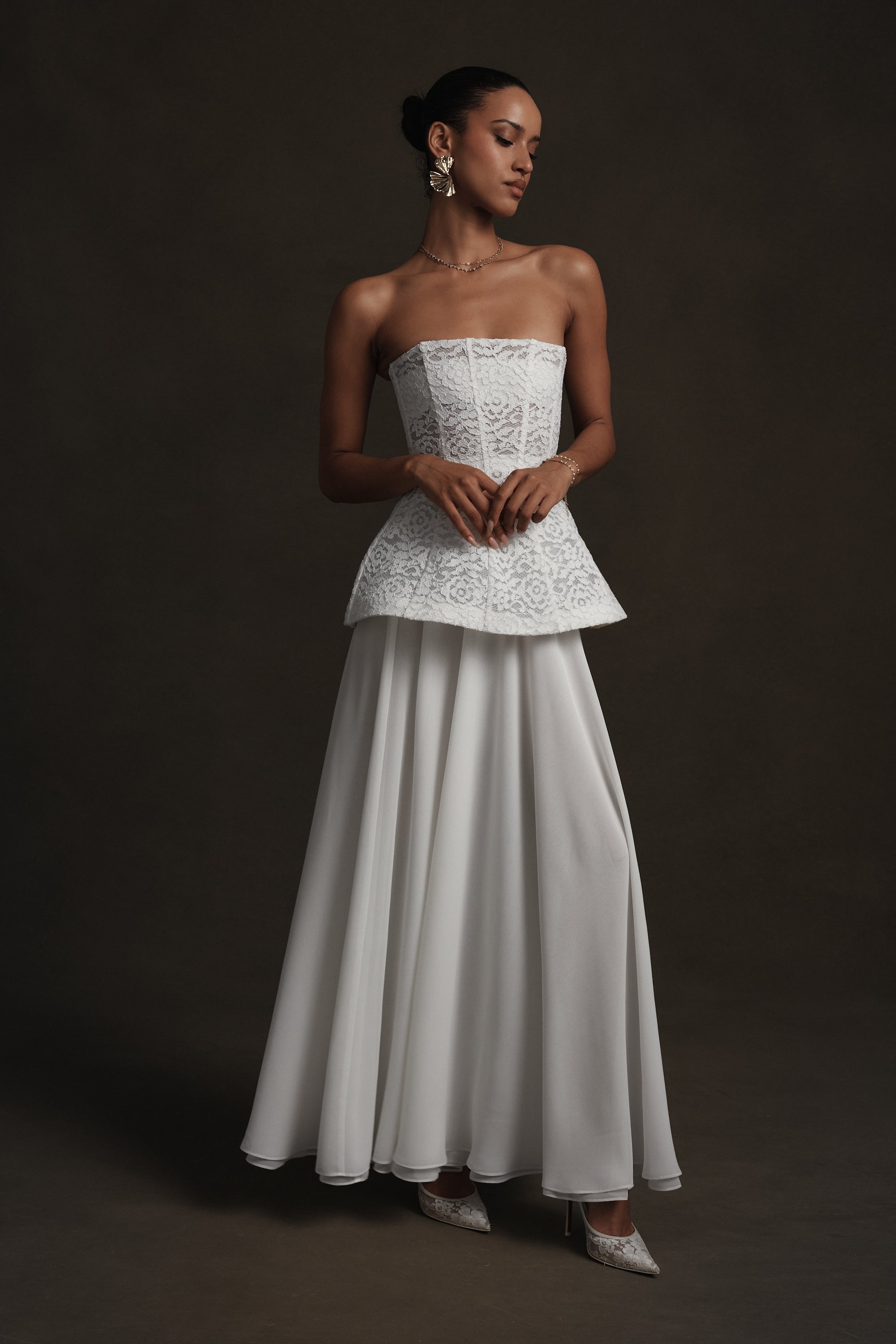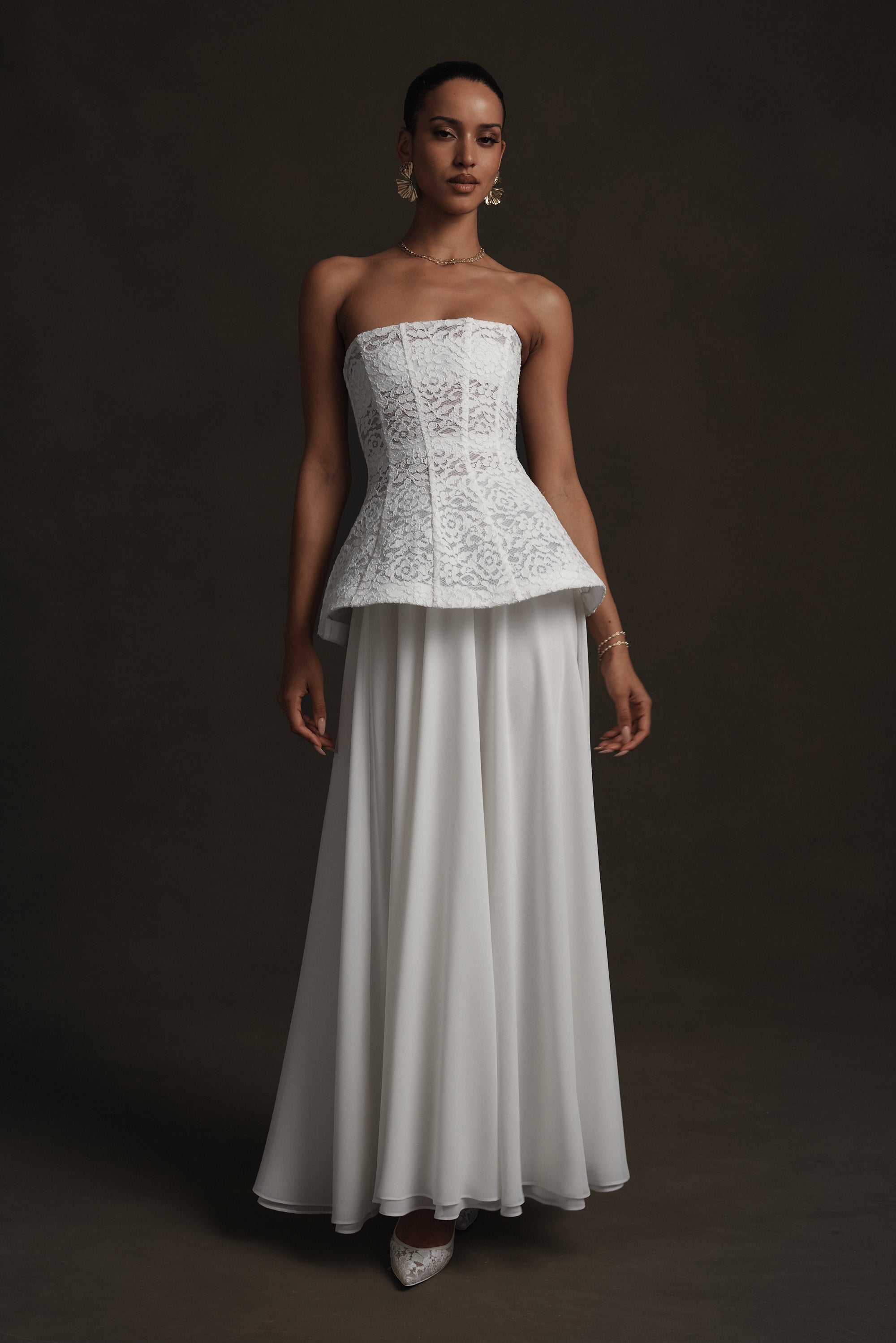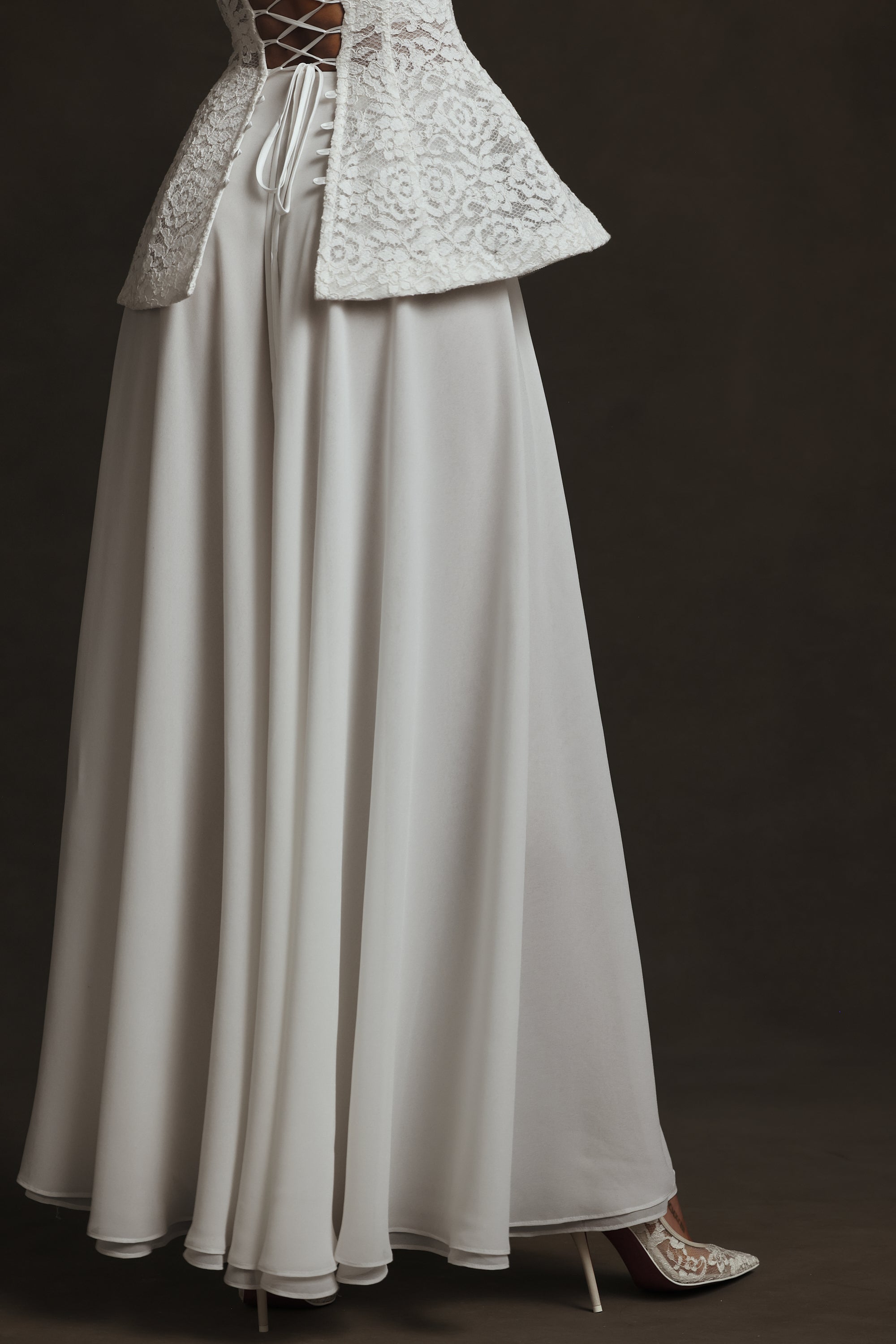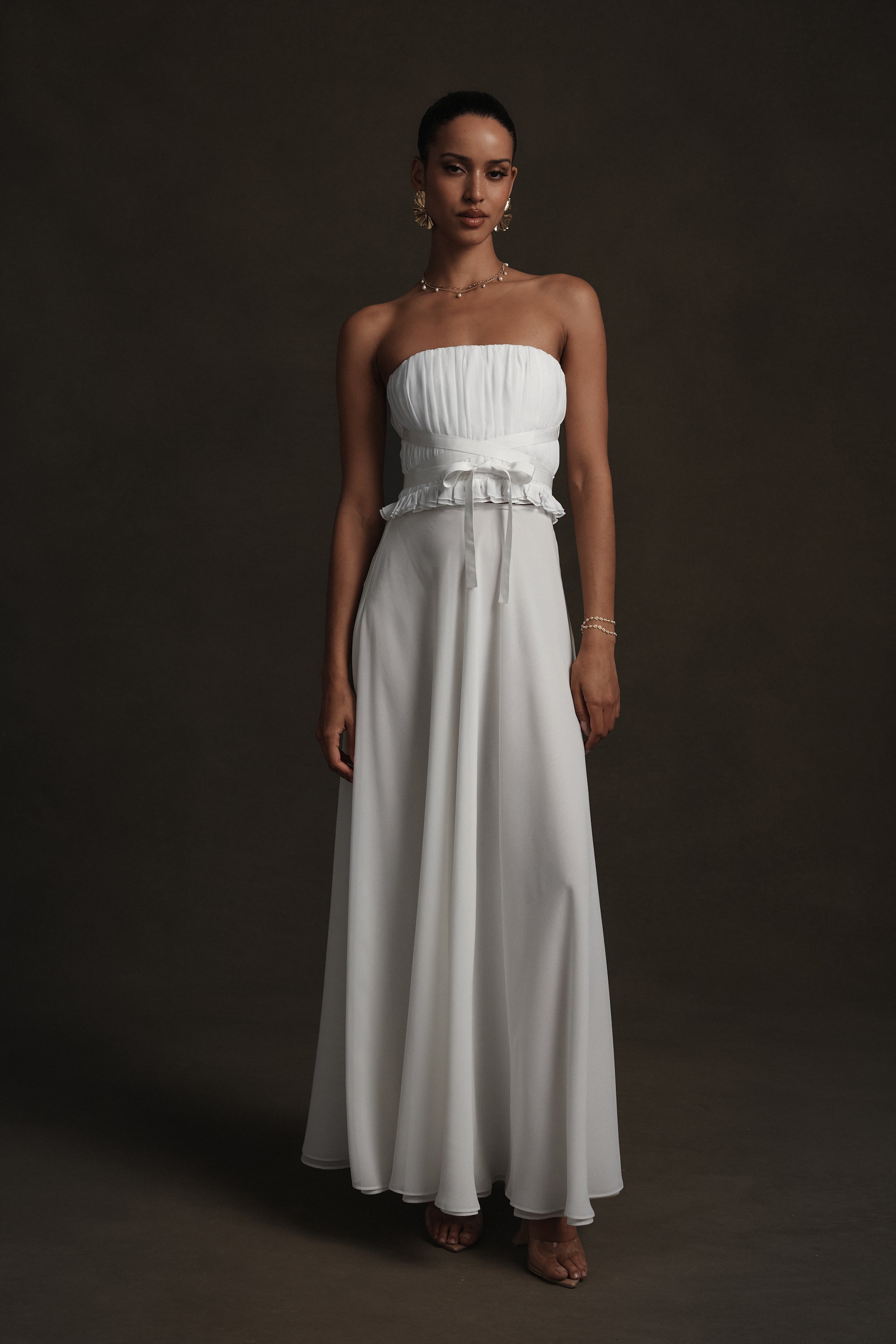 The Carter Skirt is a high-waisted, floor-length bias cut skirt. Crafted in semi-sheer white chiffon, it features soft vertical seaming that enhances its elegant movement and elongating shape. Light and airy with a graceful flow, pair Carter with The Rebecca Top for an ethereal, polished look.