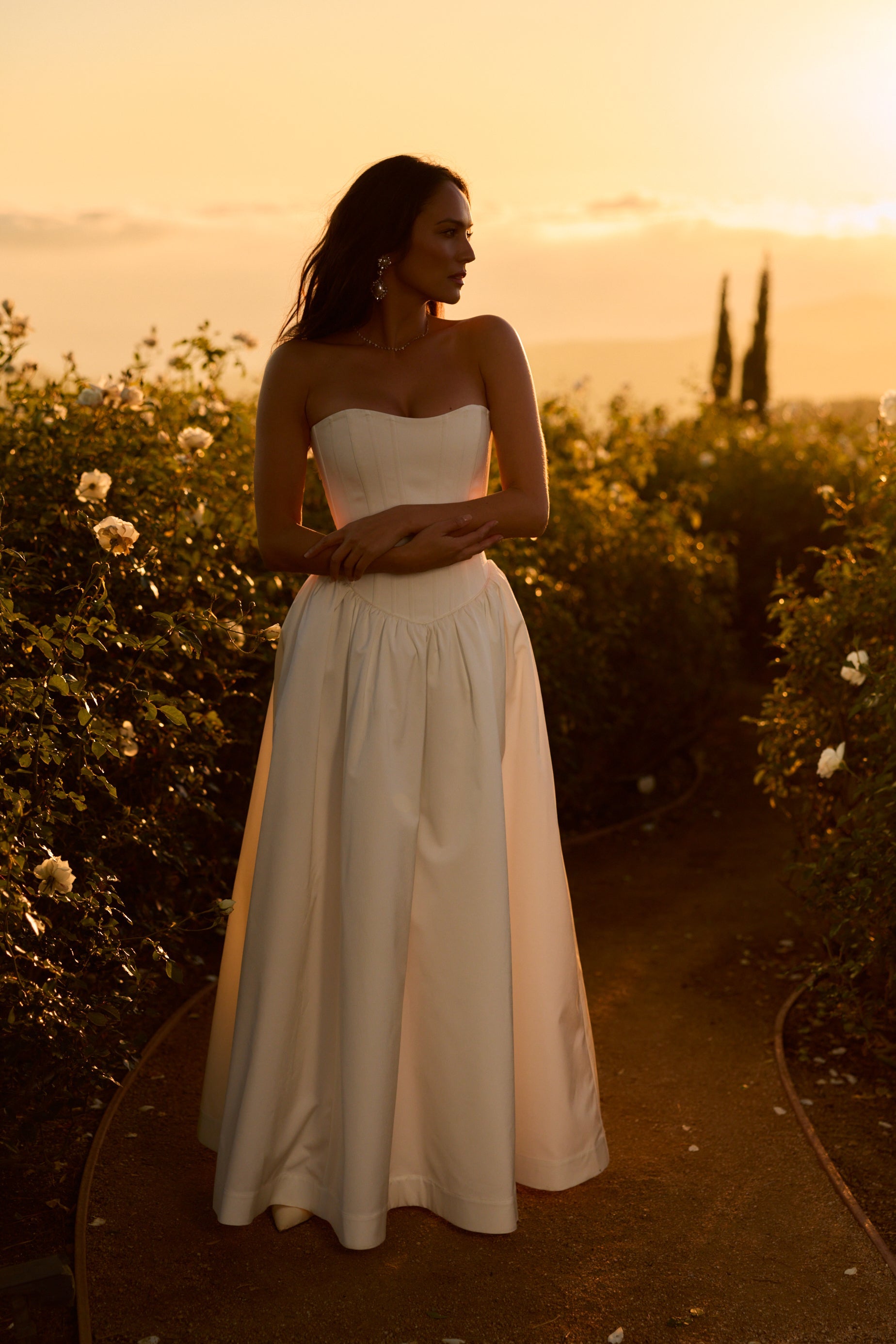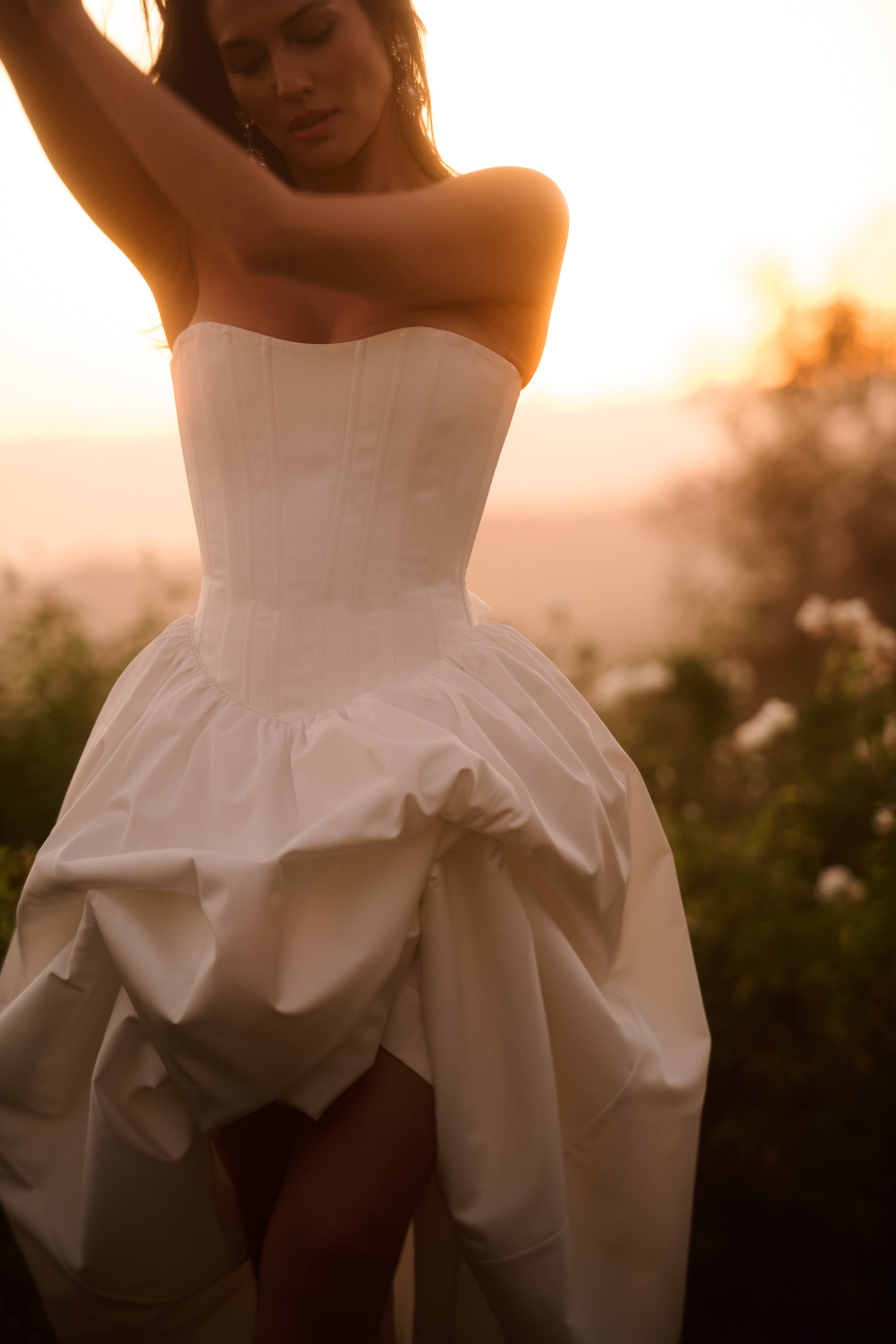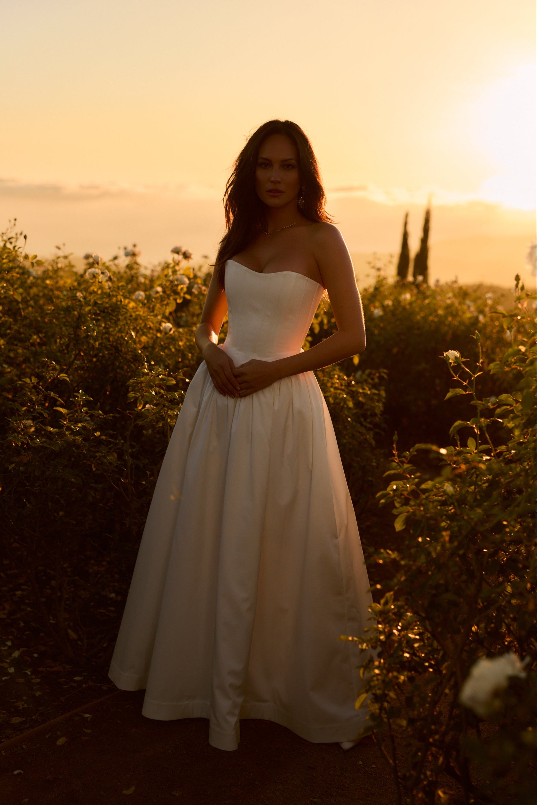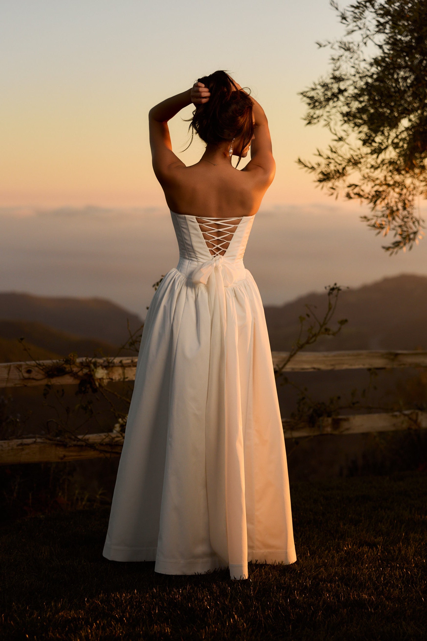 Introducing The Clara Gown, the epitome of romance! She's a strapless floor-length gown with a stunning dropped curved waist. Made in our White Crinkle Brocade, which features delicately textured organic crinkles, she flaunts a skirt with stiff tulle and mesh for a structured fit, along with a lace-up back and soft bow details. Delicate ties internally allow for optional bustling, creating soft volume and versatility. The Clara Gown is perfect for the bride seeking classic romance with thoughtful detail, and is designed to be cherished long after the last dance.