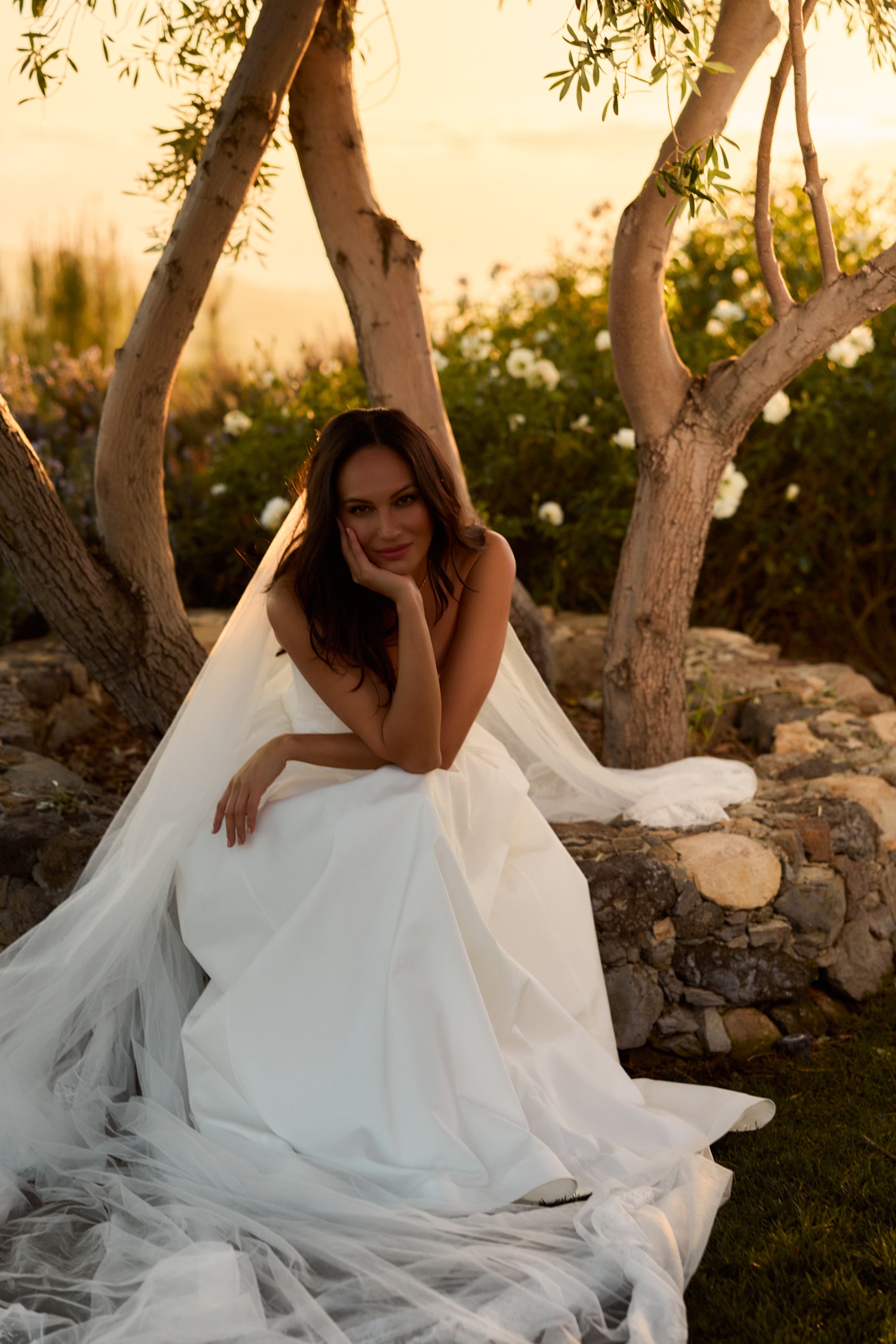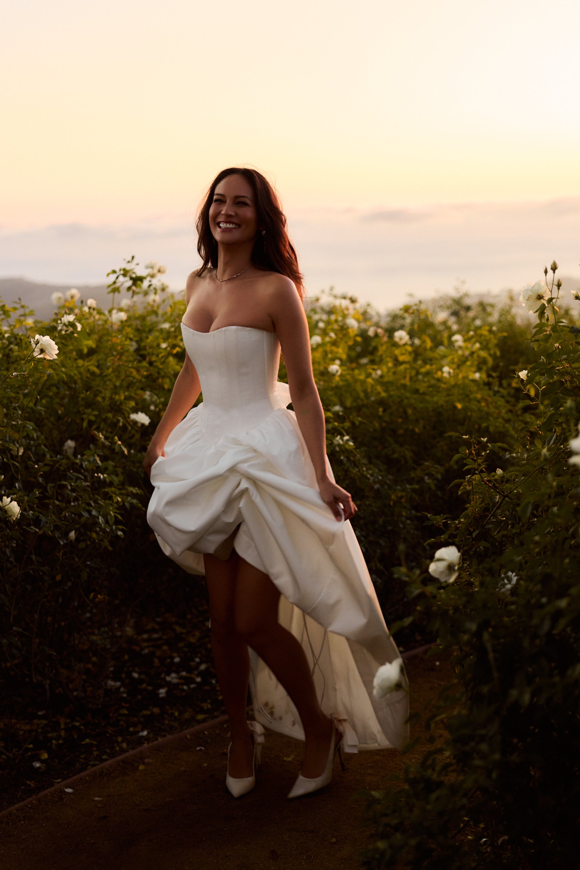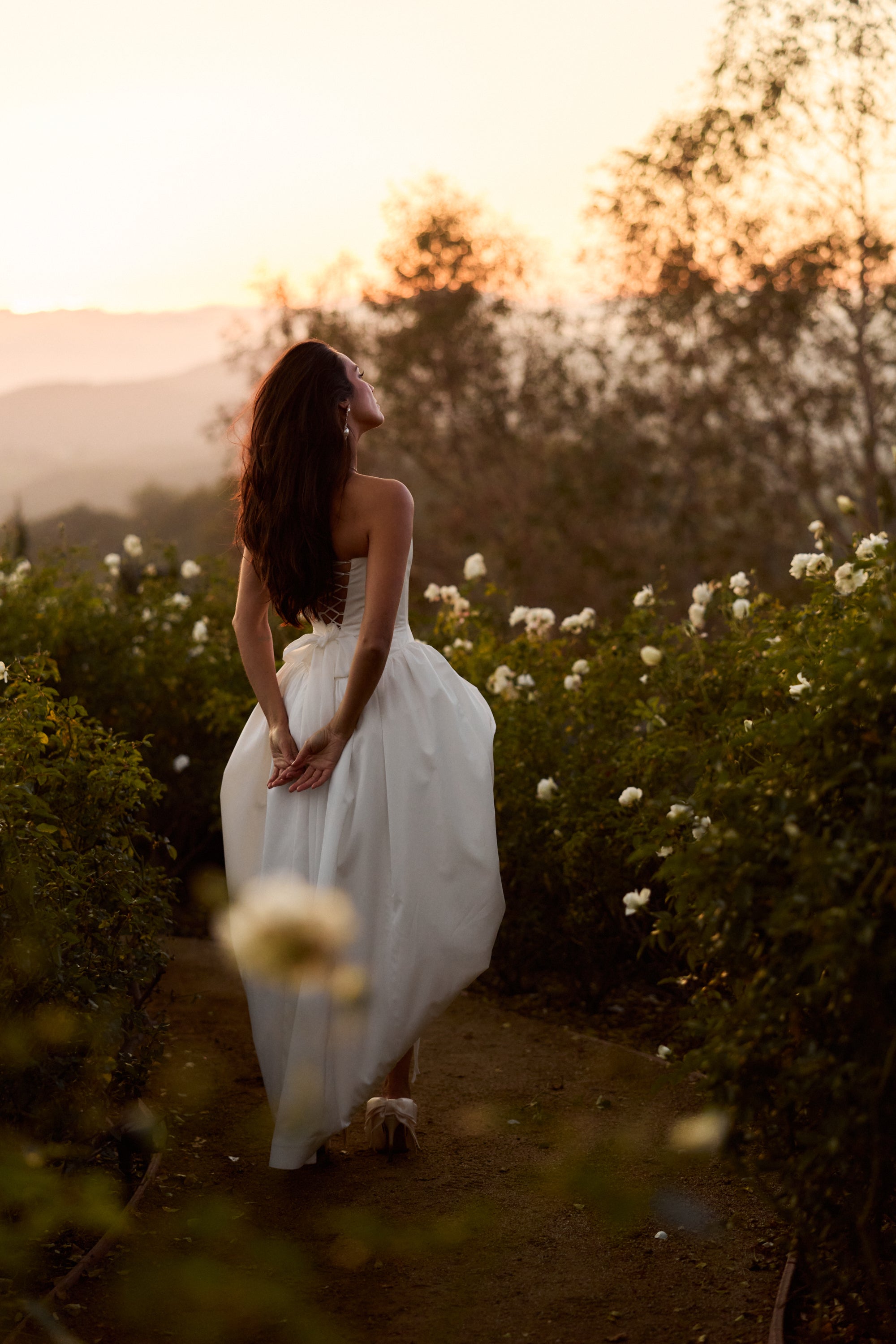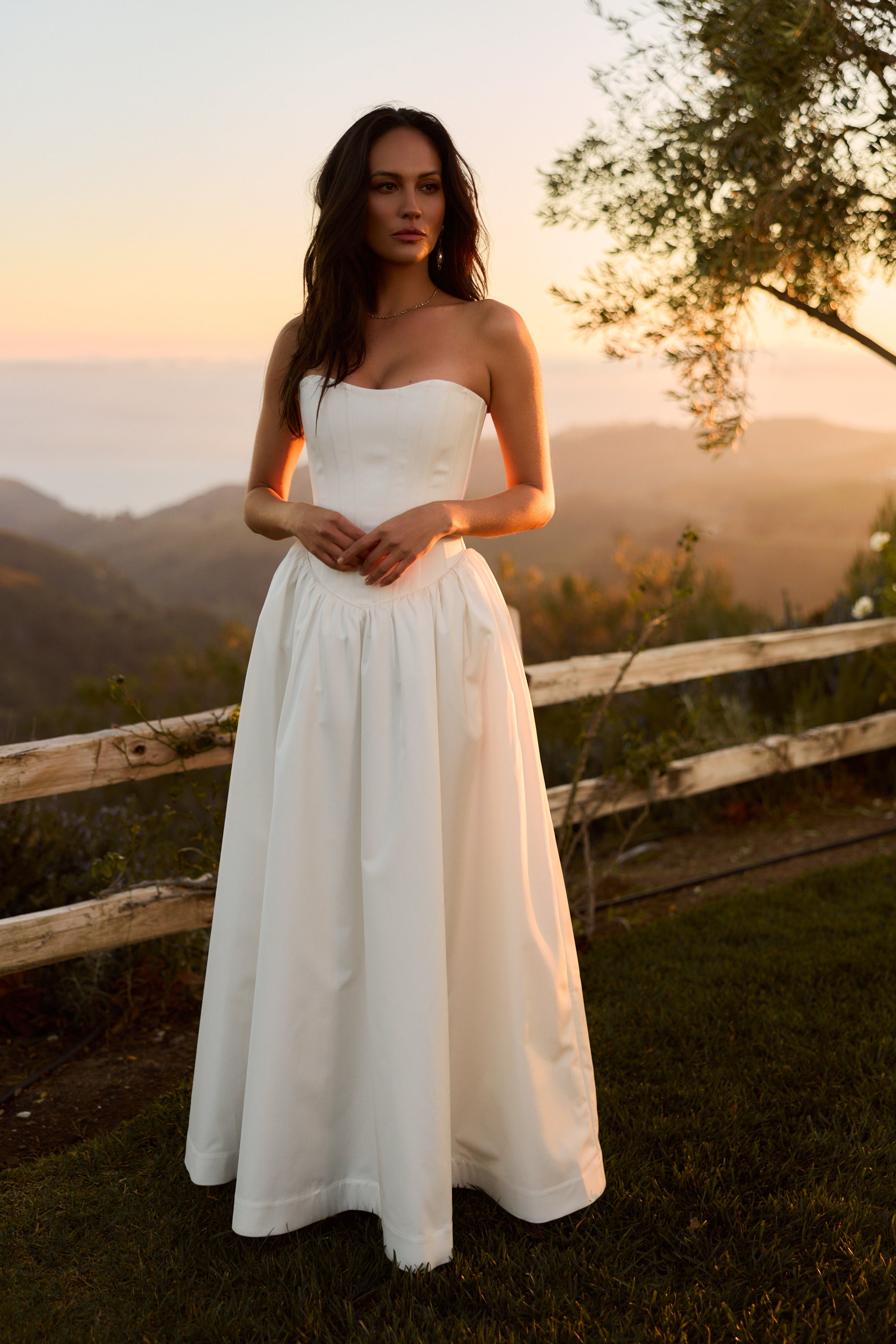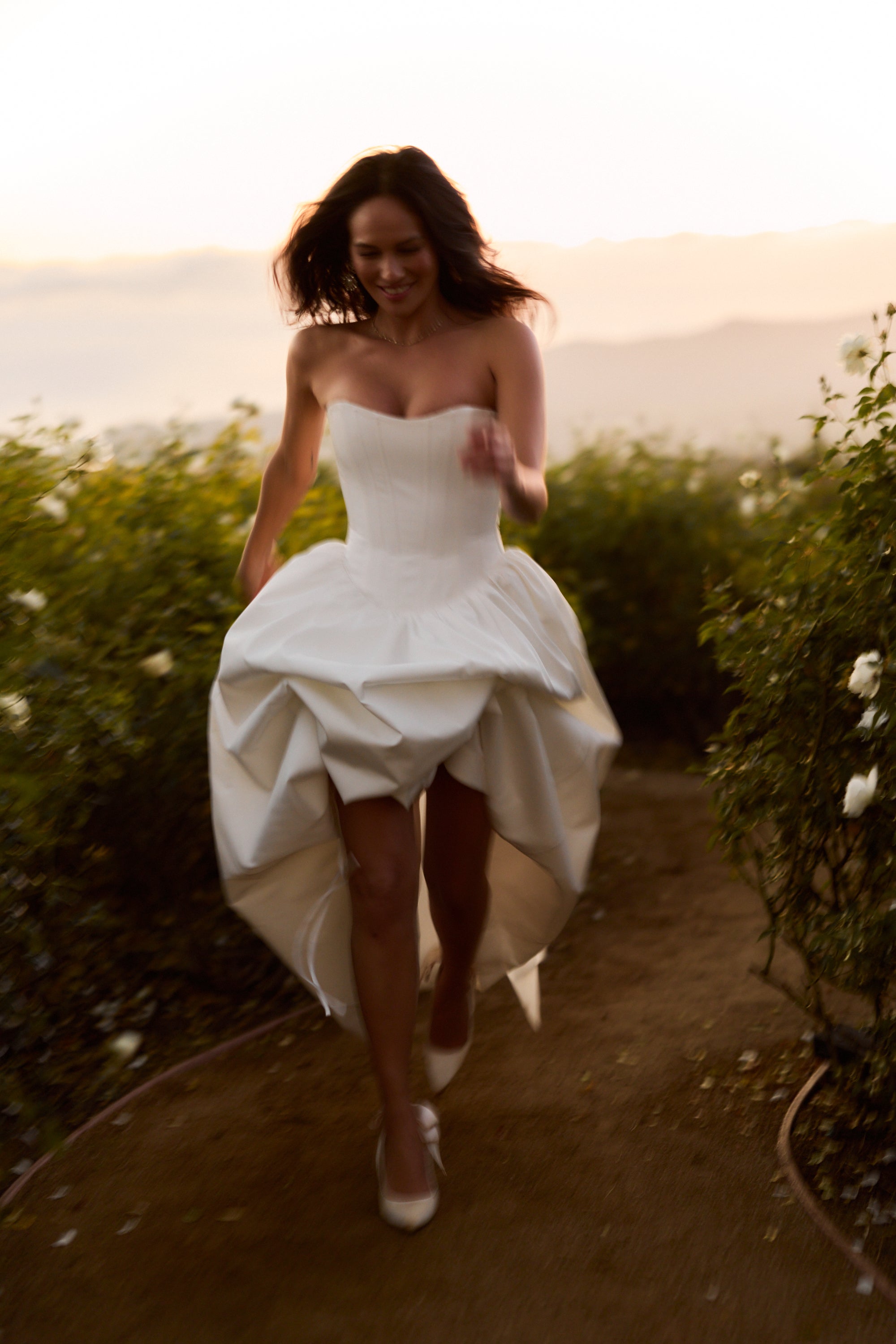 Introducing The Clara Gown, the epitome of romance! She's a strapless floor-length gown with a stunning dropped curved waist. Made in our White Crinkle Brocade, which features delicately textured organic crinkles, she flaunts a skirt with stiff tulle and mesh for a structured fit, along with a lace-up back and soft bow details. Delicate ties internally allow for optional bustling, creating soft volume and versatility. The Clara Gown is perfect for the bride seeking classic romance with thoughtful detail, and is designed to be cherished long after the last dance.