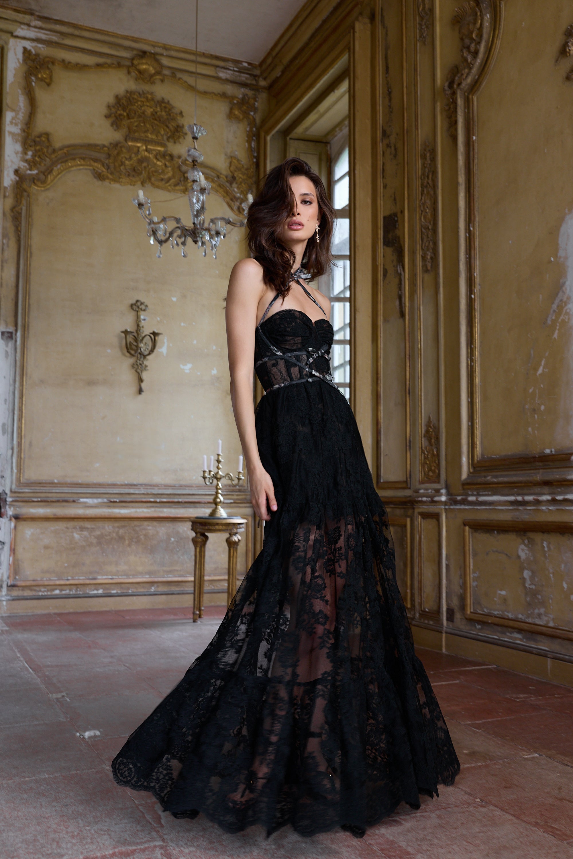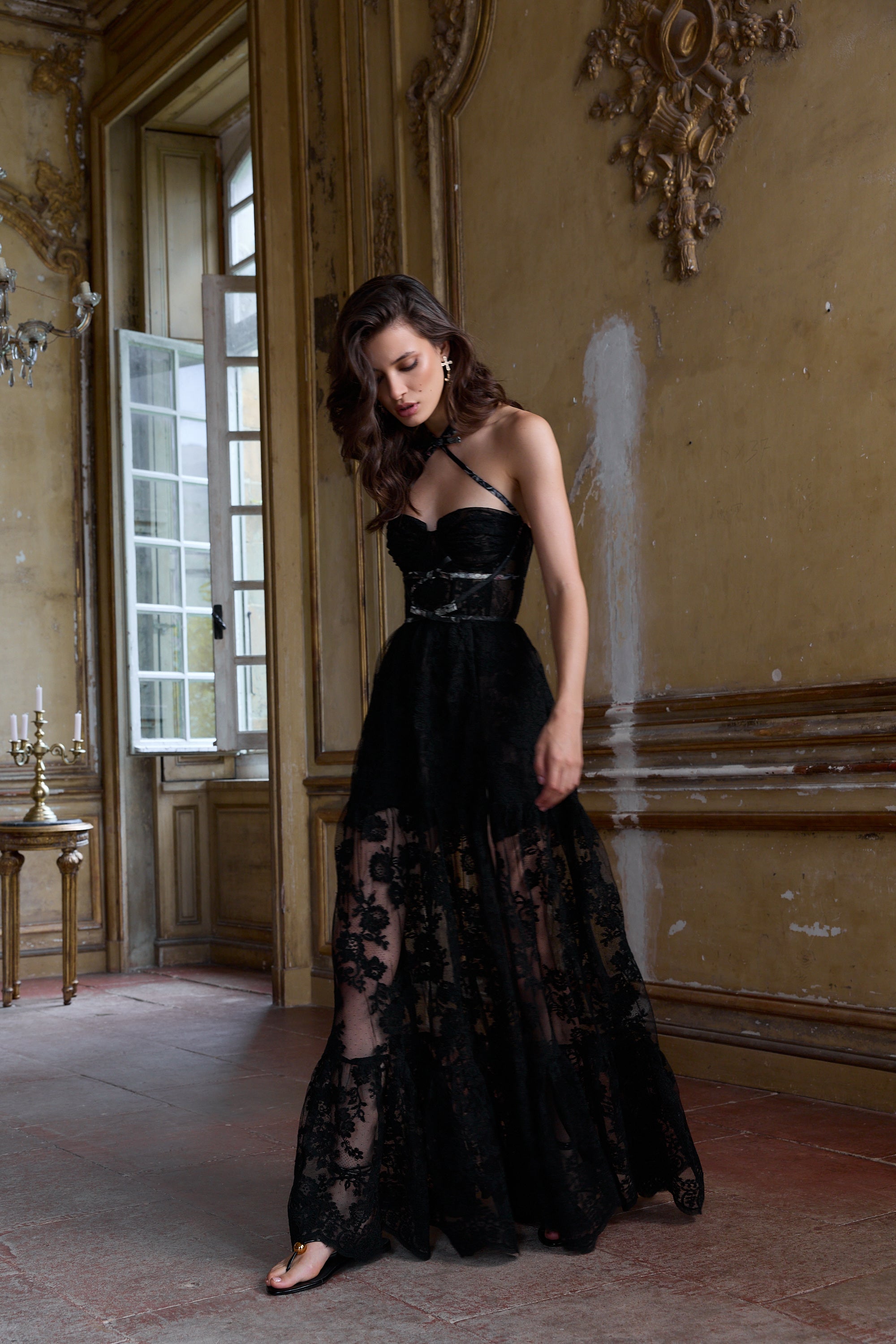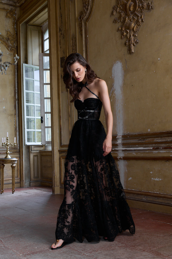 Introducing Eloise! She is a corset and full-length tiered dress. Made from our beautifully embroidered Black Chantilly Lace, she features dainty lace with mesh backing. Eloise features a mini-length lace and mesh skirt lining, hand-corded lace details, and criss-crossed brocade bow detailing in contrasting fabric. The bow detailing can be worn in multiple ways!