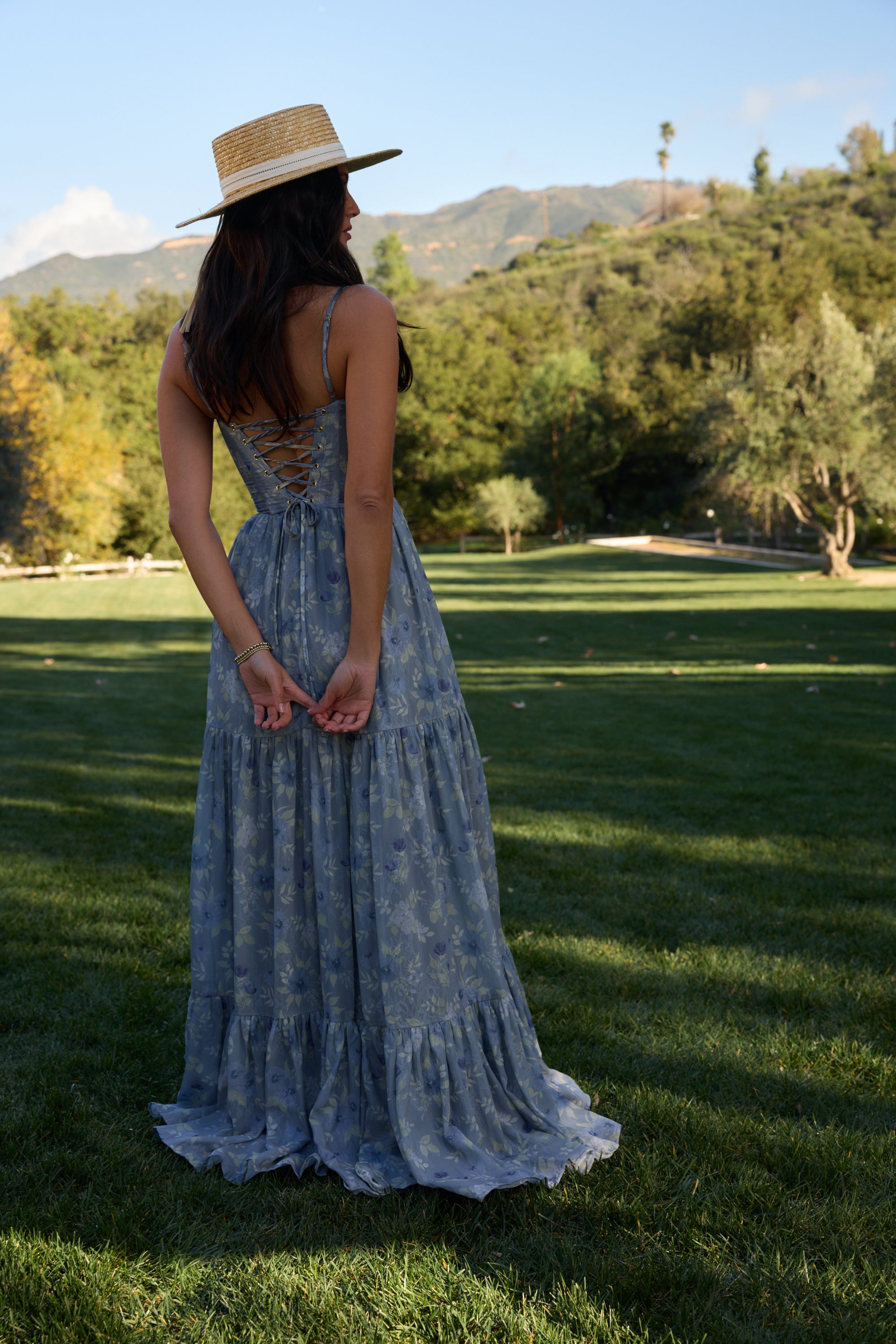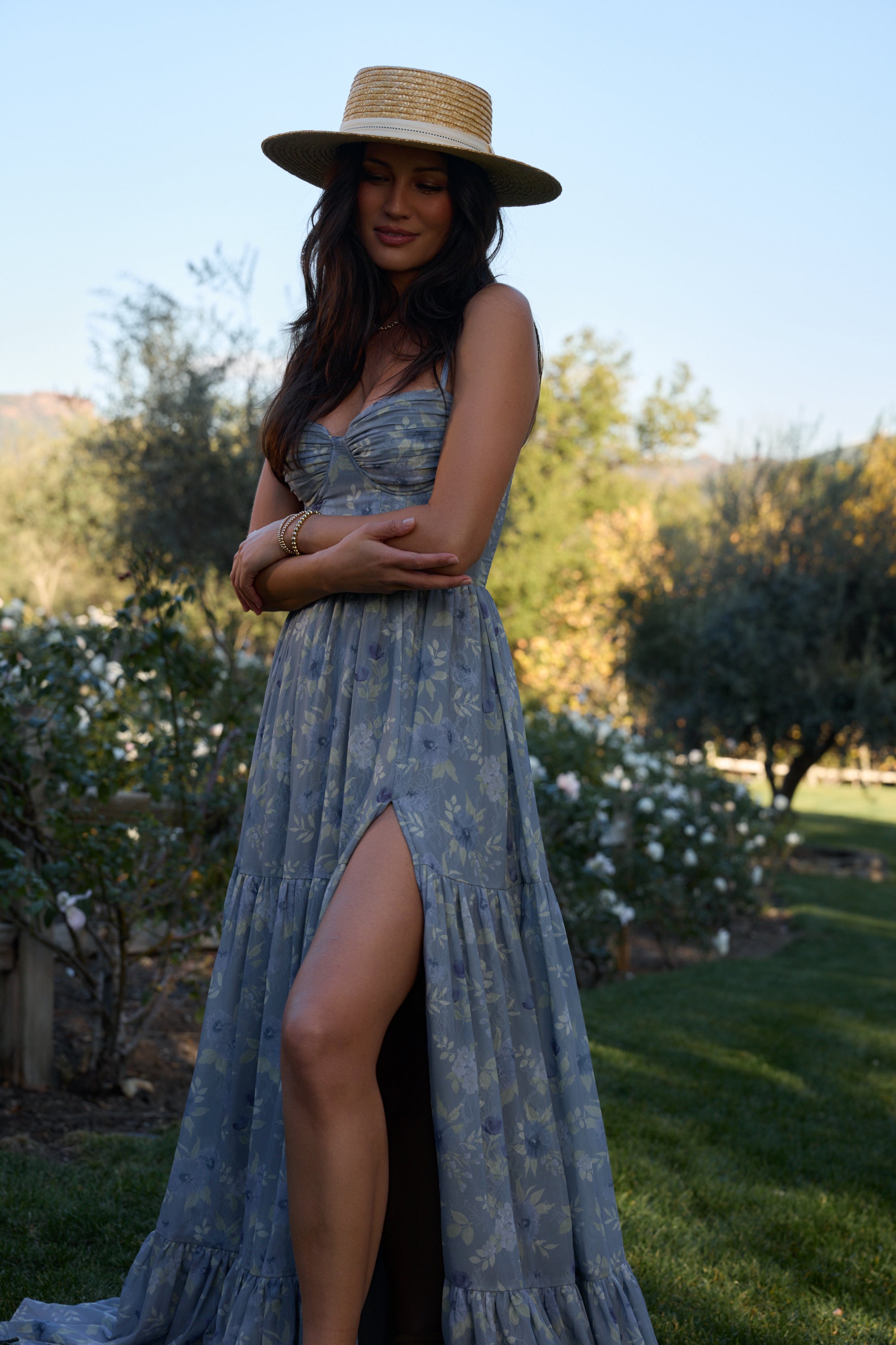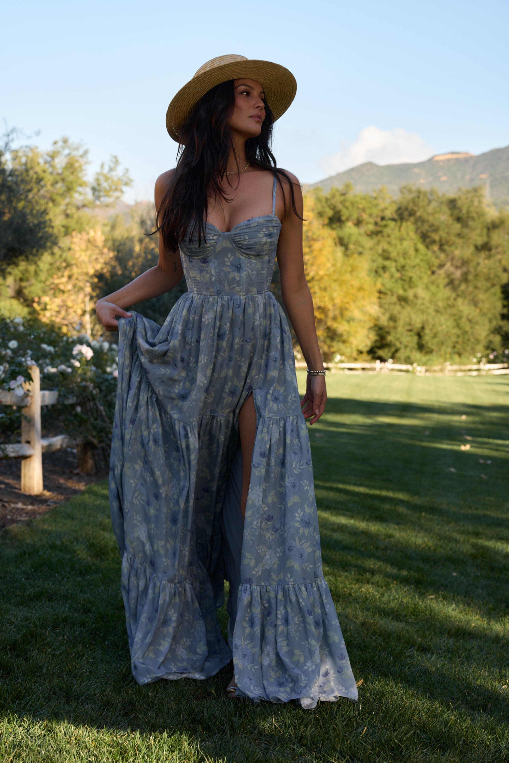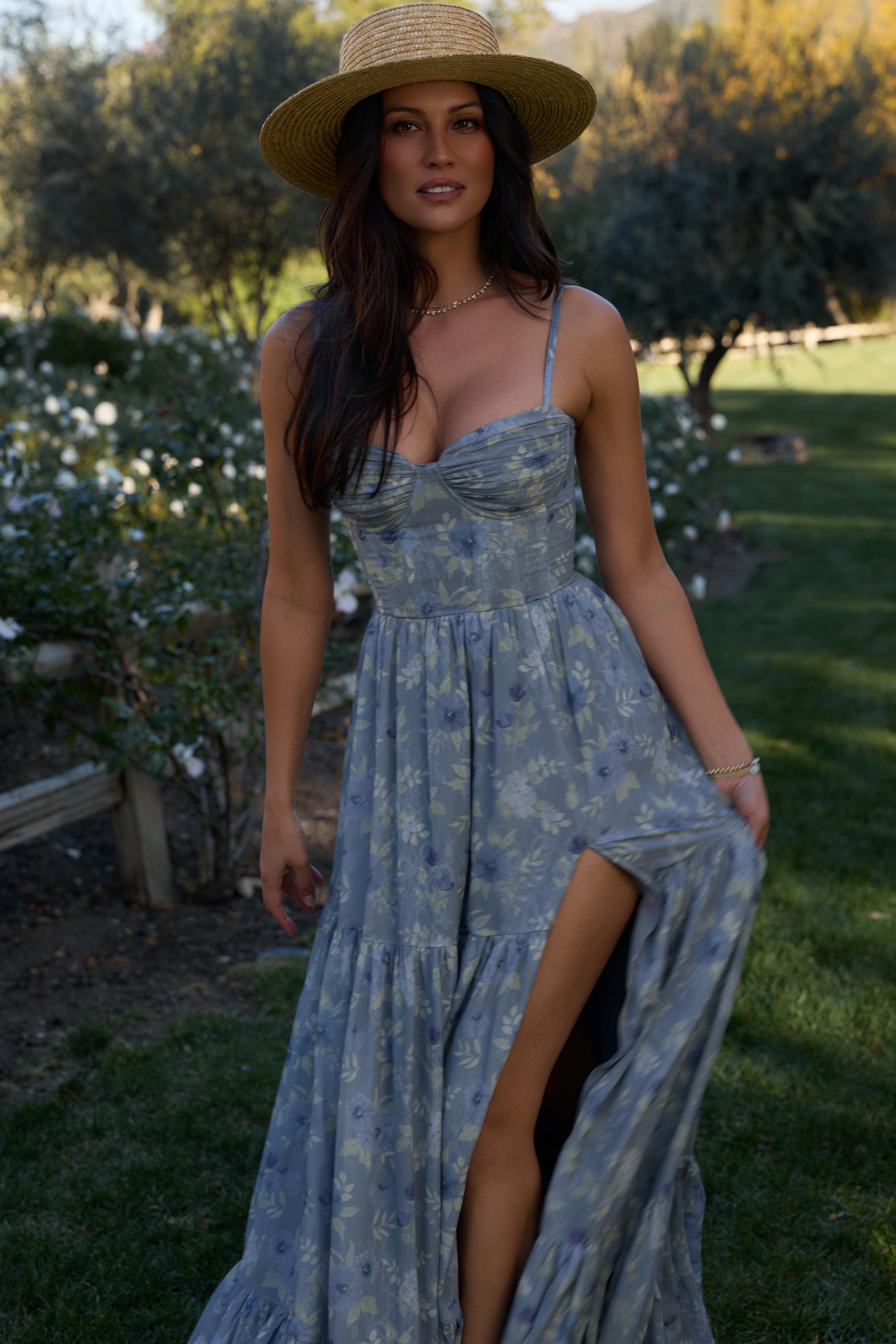 Meet The Gwen Dress! She's a delicate corset gown with gathered skirt tiers. Her gathered bust cups and bodice are embellished with opulent pearl and crystal beaded trim. She's made in our Aleutian Blue Floral print, which features a mix of blue florals and beige leaves on a stone blue background. Fall in love with this breathtaking watercolor dream.
