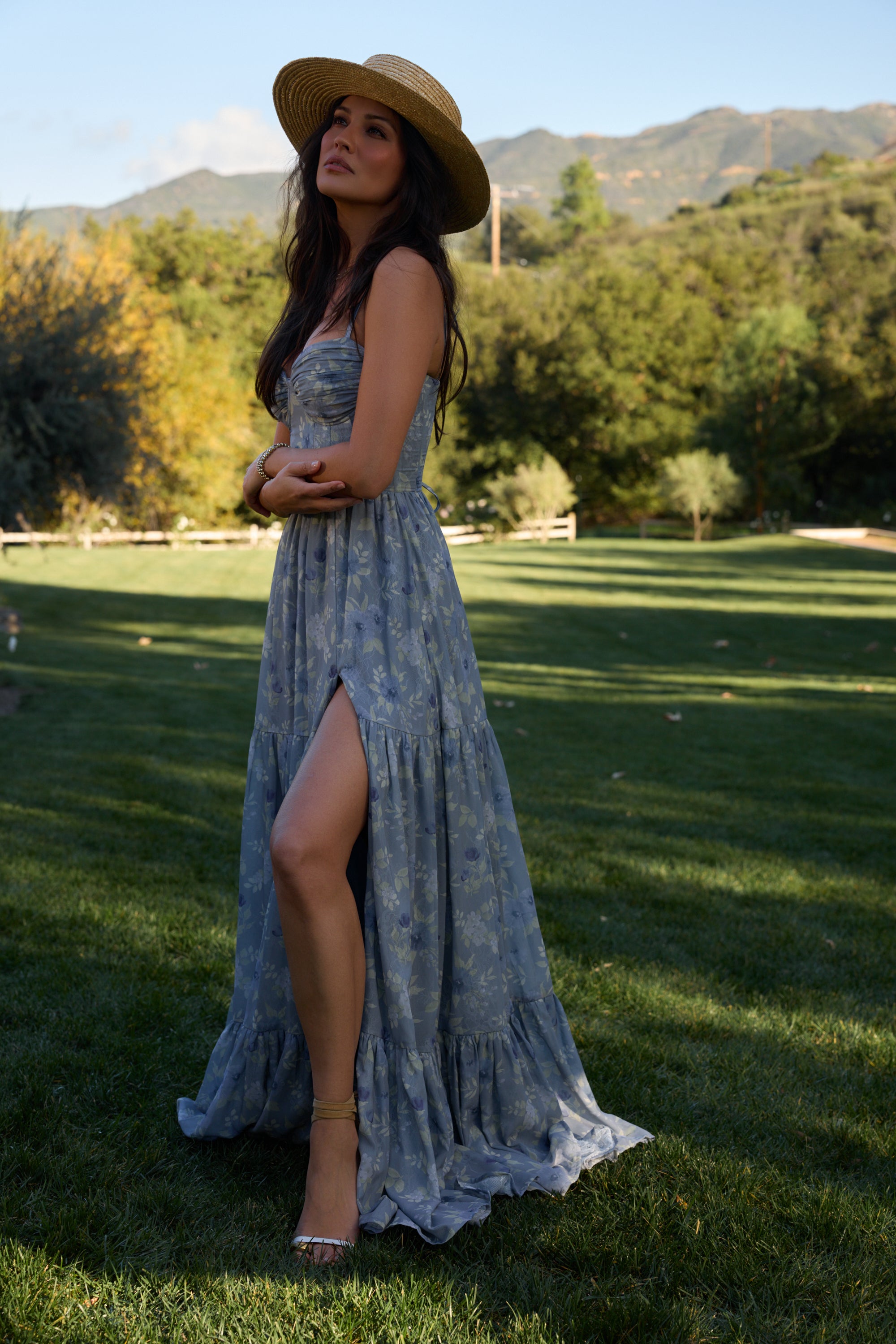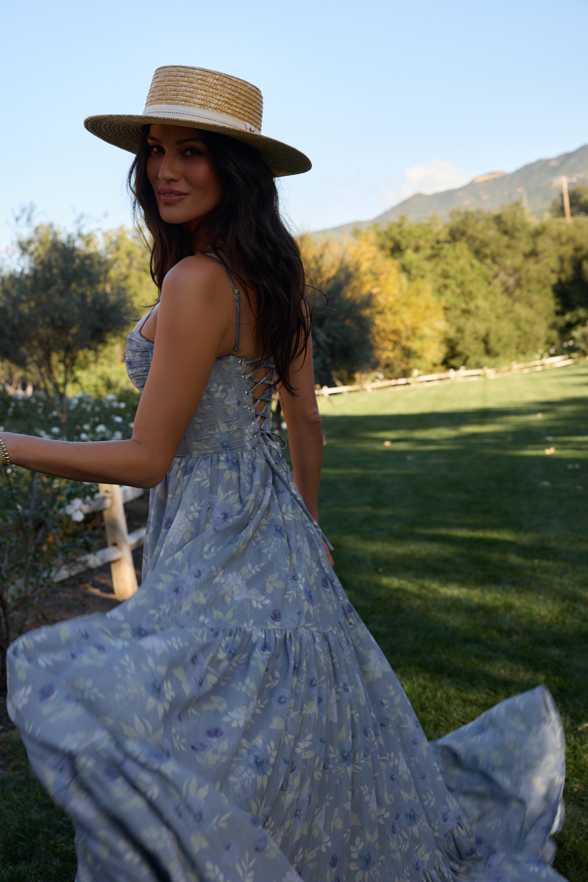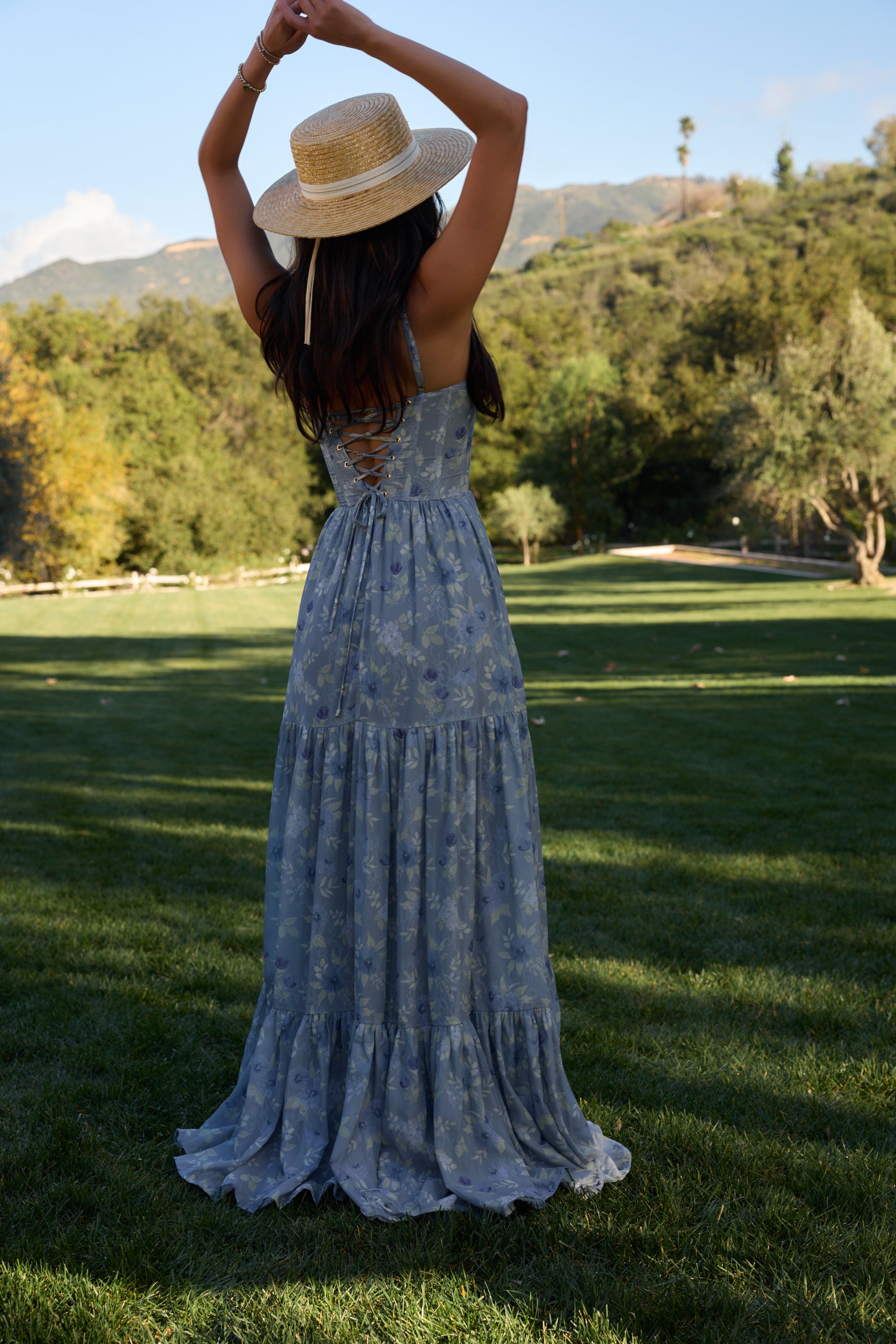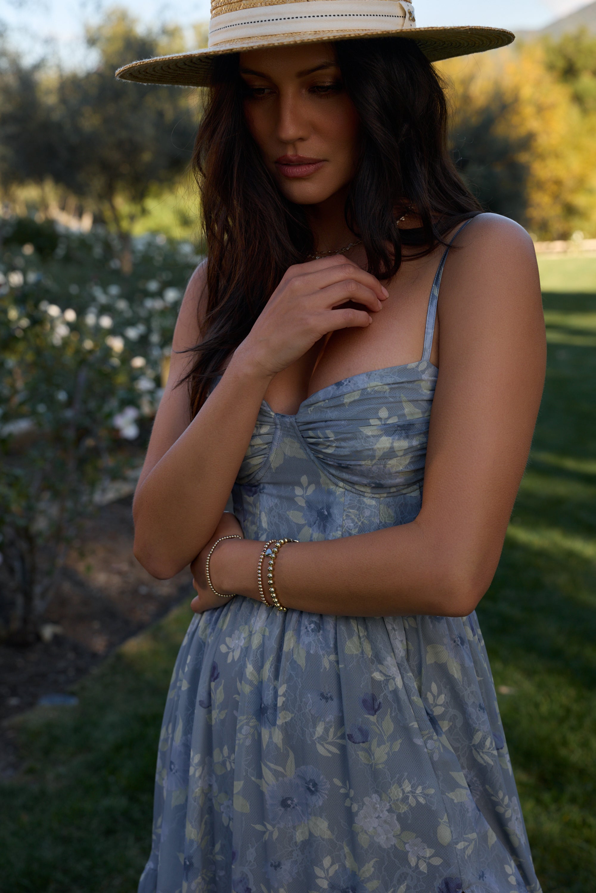 Meet The Gwen Dress! She's a delicate corset gown with gathered skirt tiers. Her gathered bust cups and bodice are embellished with opulent pearl and crystal beaded trim. She's made in our Aleutian Blue Floral print, which features a mix of blue florals and beige leaves on a stone blue background. Fall in love with this breathtaking watercolor dream.
