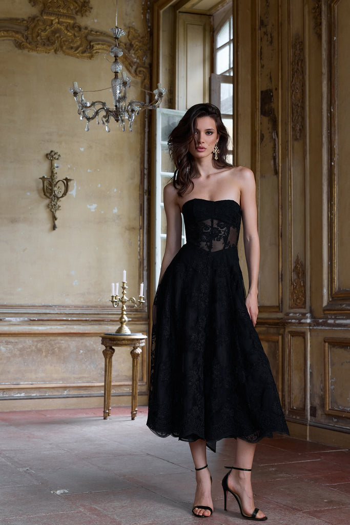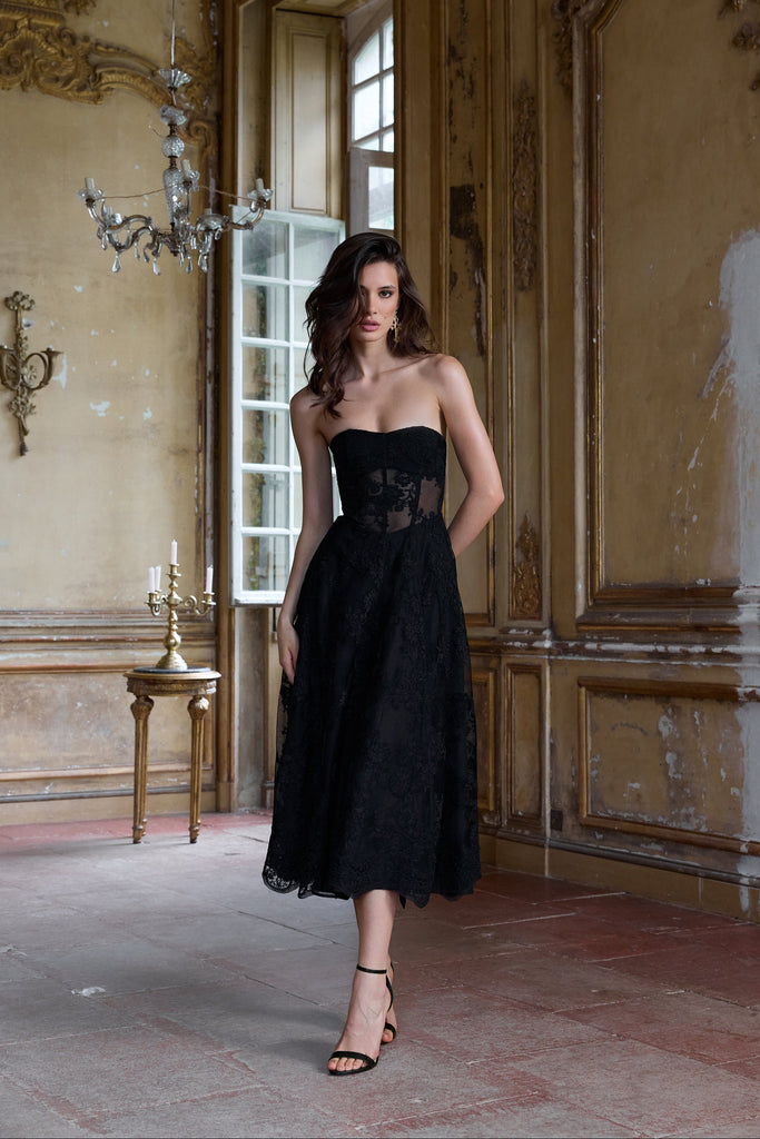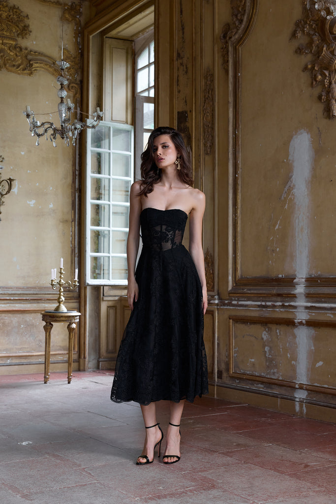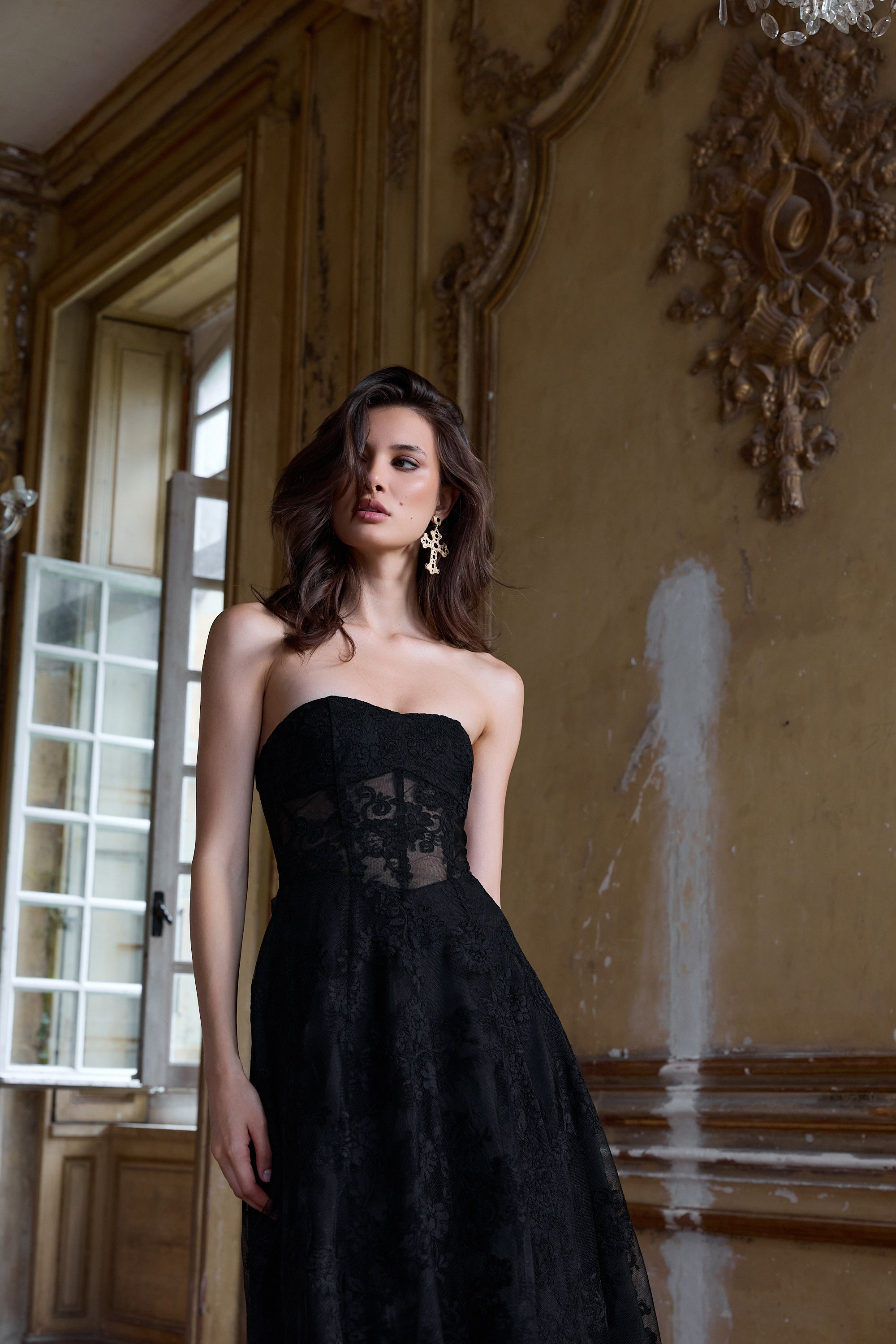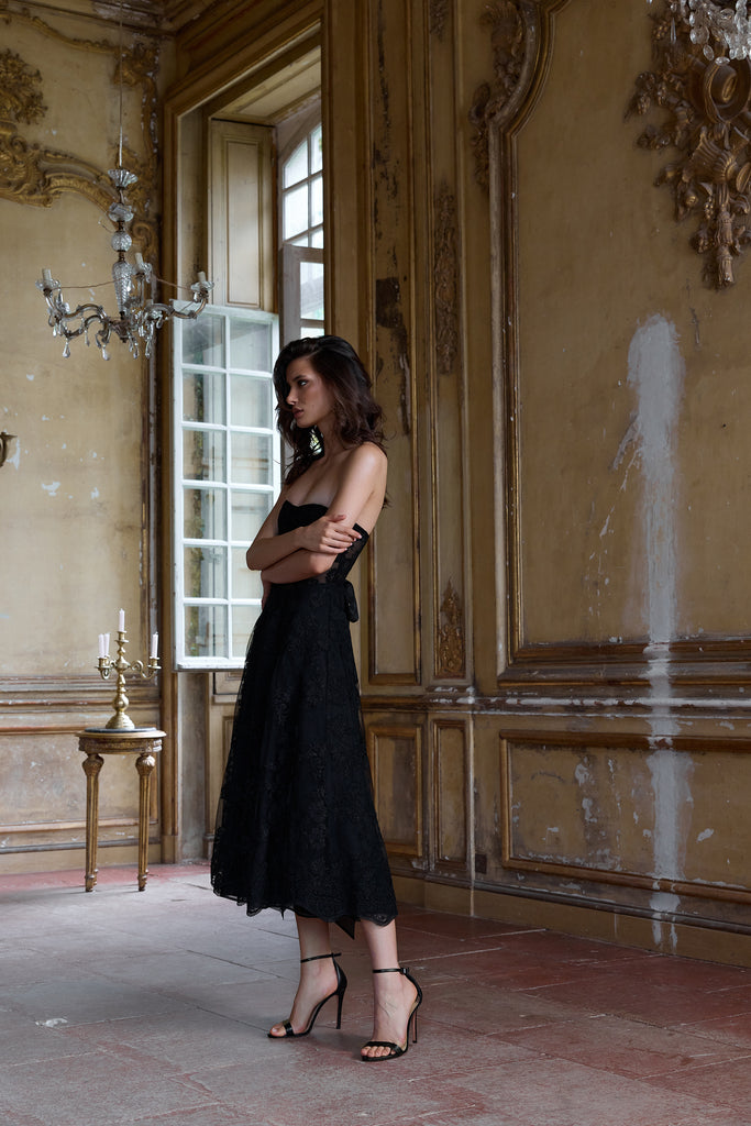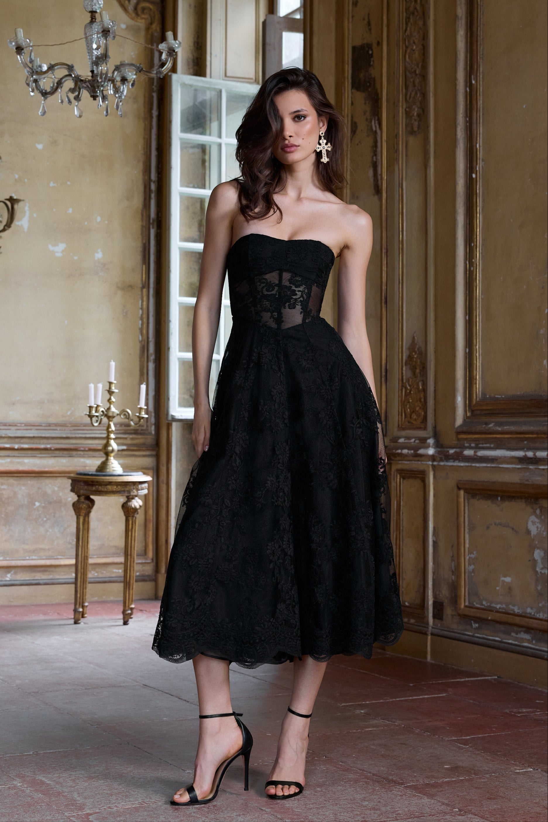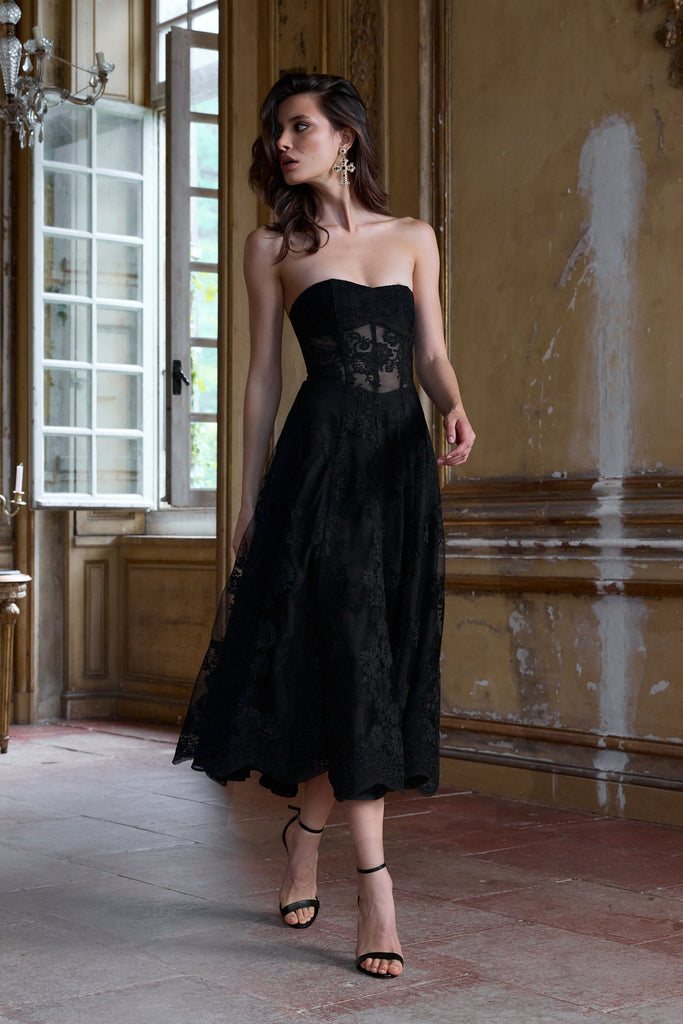 The Hazel Dress is a strapless midi-length dress with stunning lace details. She flaunts a corset bodice and a bow accent in the back. Made from our beautifully embroidered Black Chantilly Lace, she's the perfect dress for any occasion!