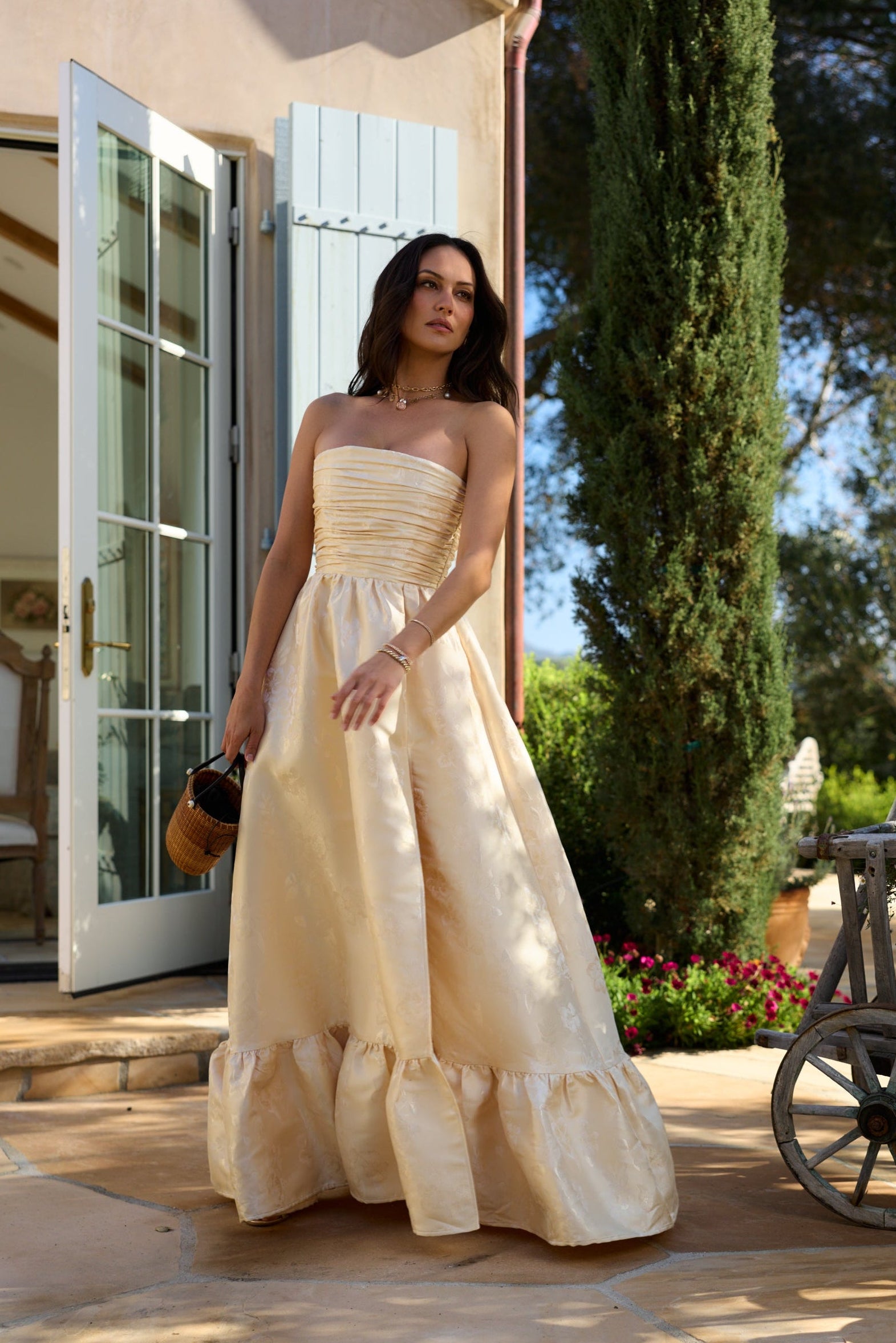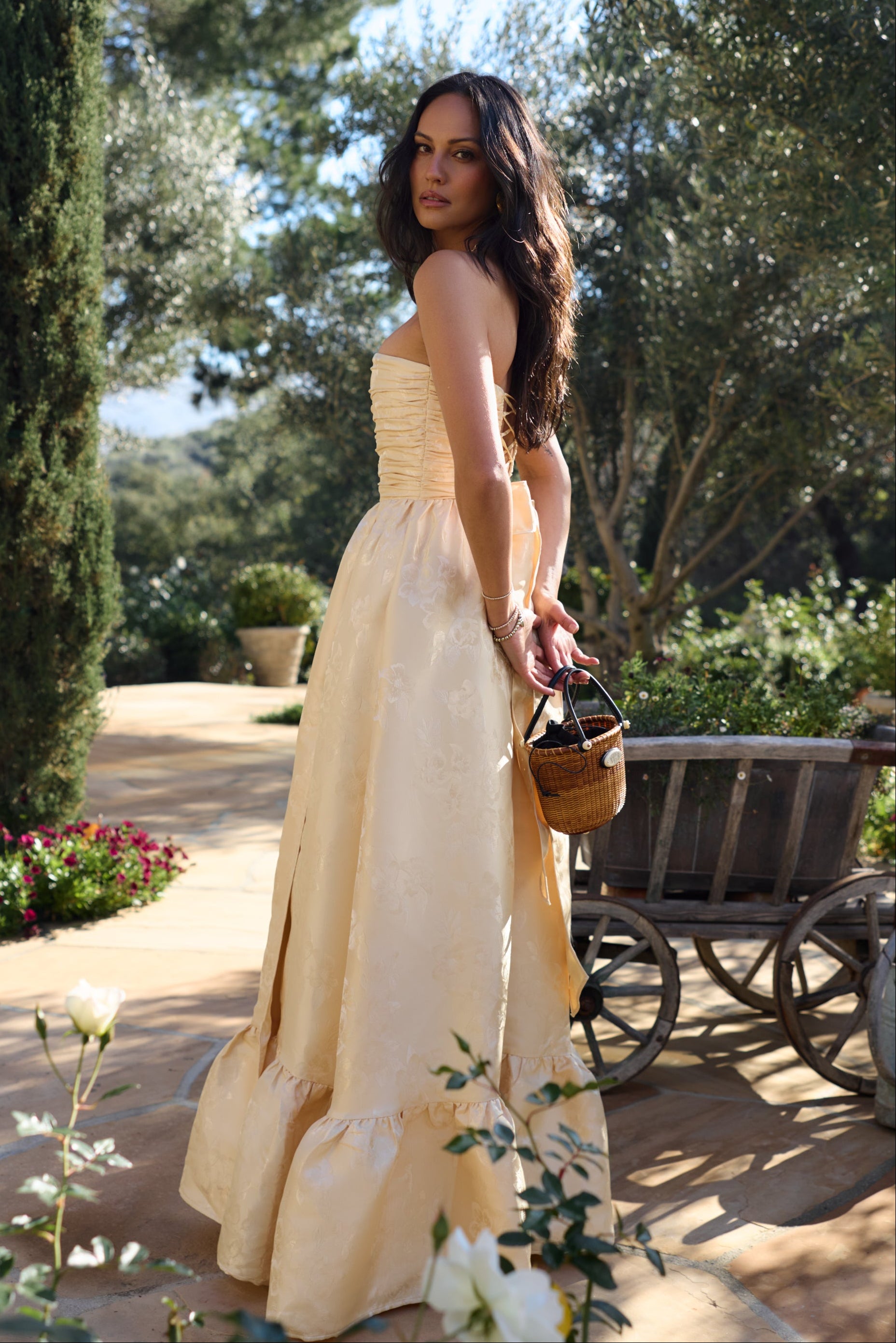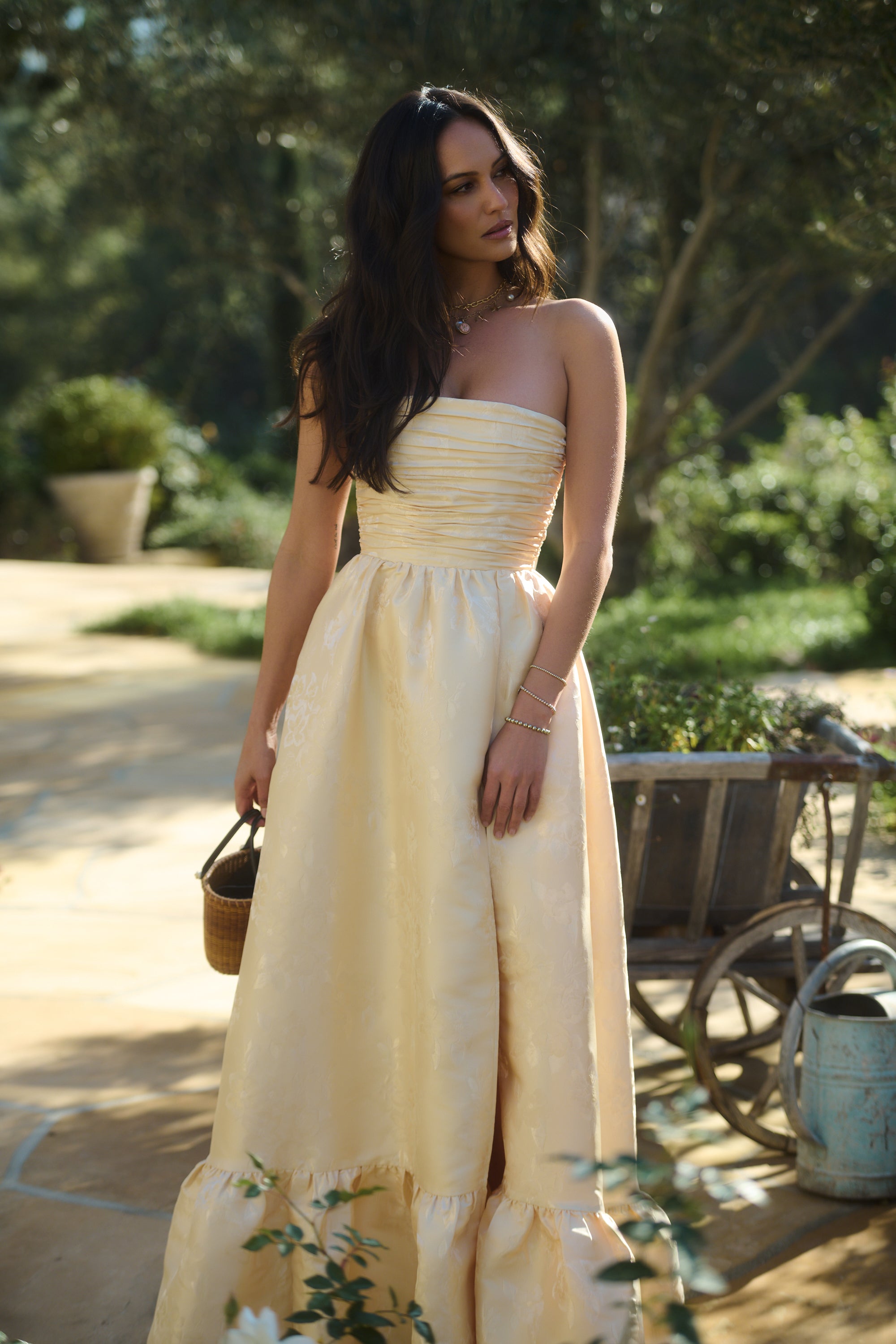 Meet Regina, the perfect strapless gown featuring all things classy and elegant. She's made from our romantic Butter Yellow Baroque Floral, which features tonal florals on a soft tonal buttery floral background. Fall in love with her gathered corset bodice, gathered tier skirt, and lace-up closure. Dance the night away in this brocade dream.