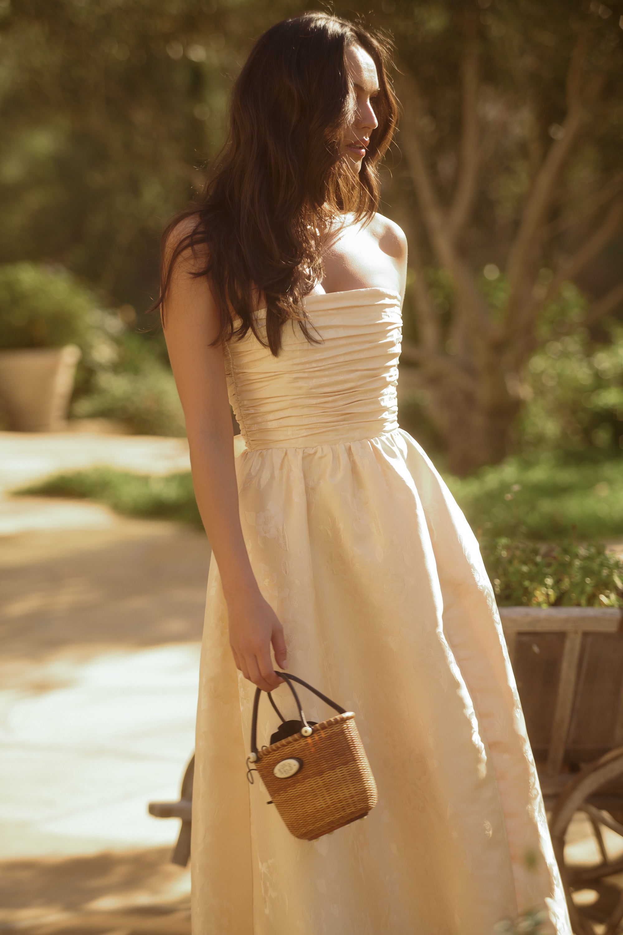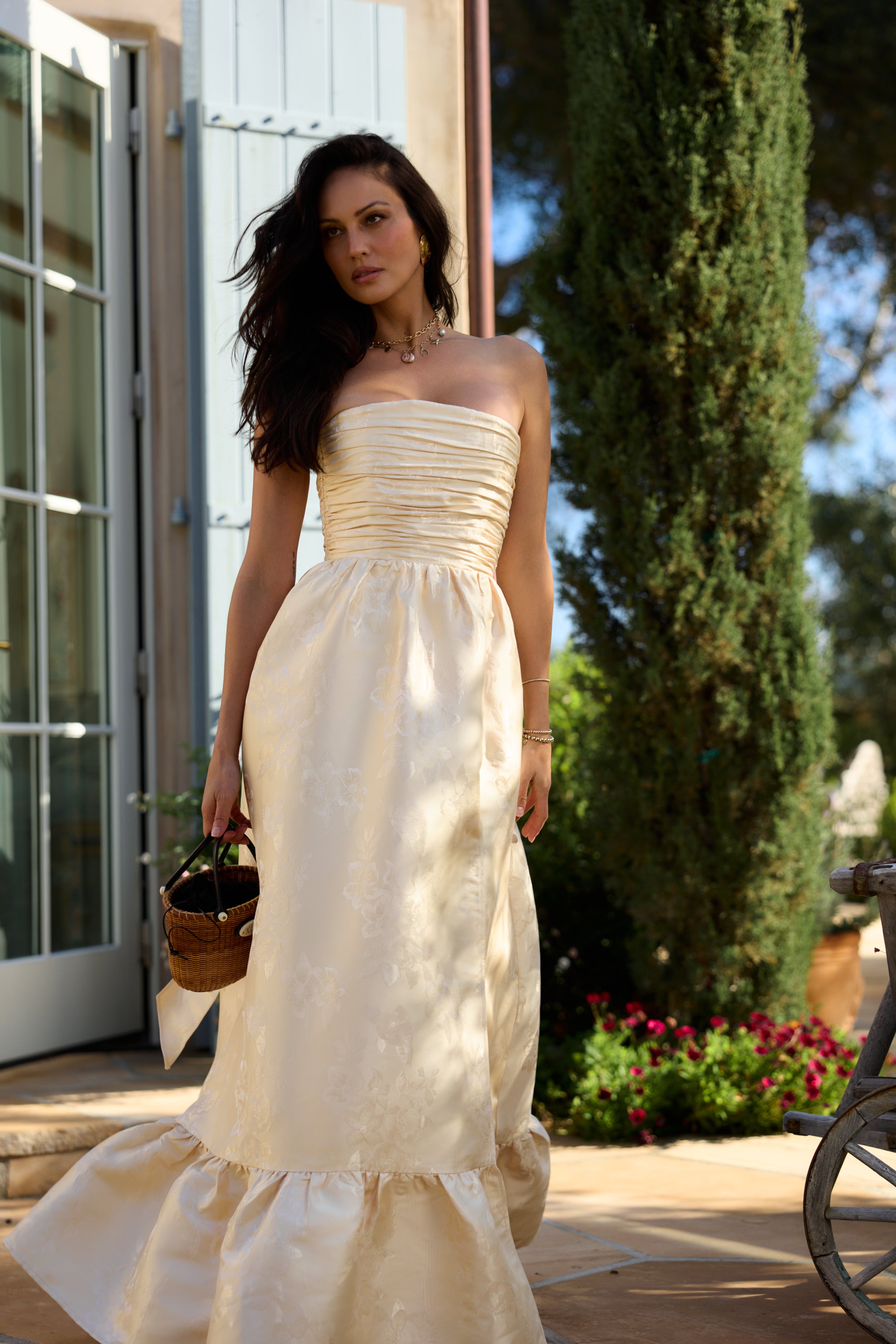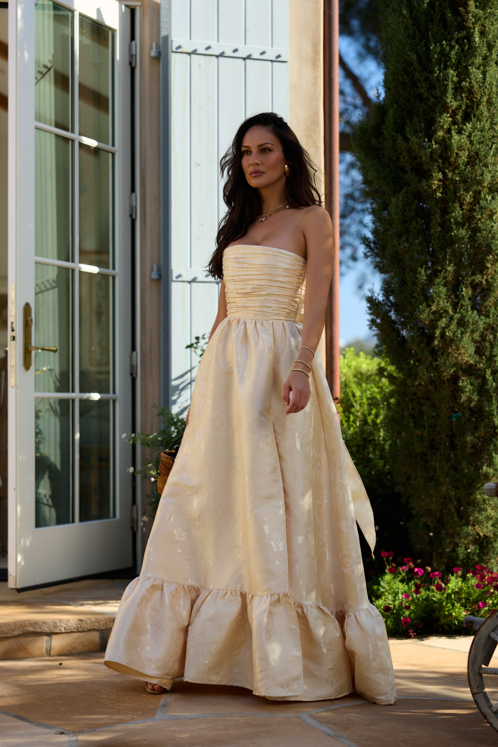 Meet Regina, the perfect strapless gown featuring all things classy and elegant. She's made from our romantic Butter Yellow Baroque Floral, which features tonal florals on a soft tonal buttery floral background. Fall in love with her gathered corset bodice, gathered tier skirt, and lace-up closure. Dance the night away in this brocade dream.