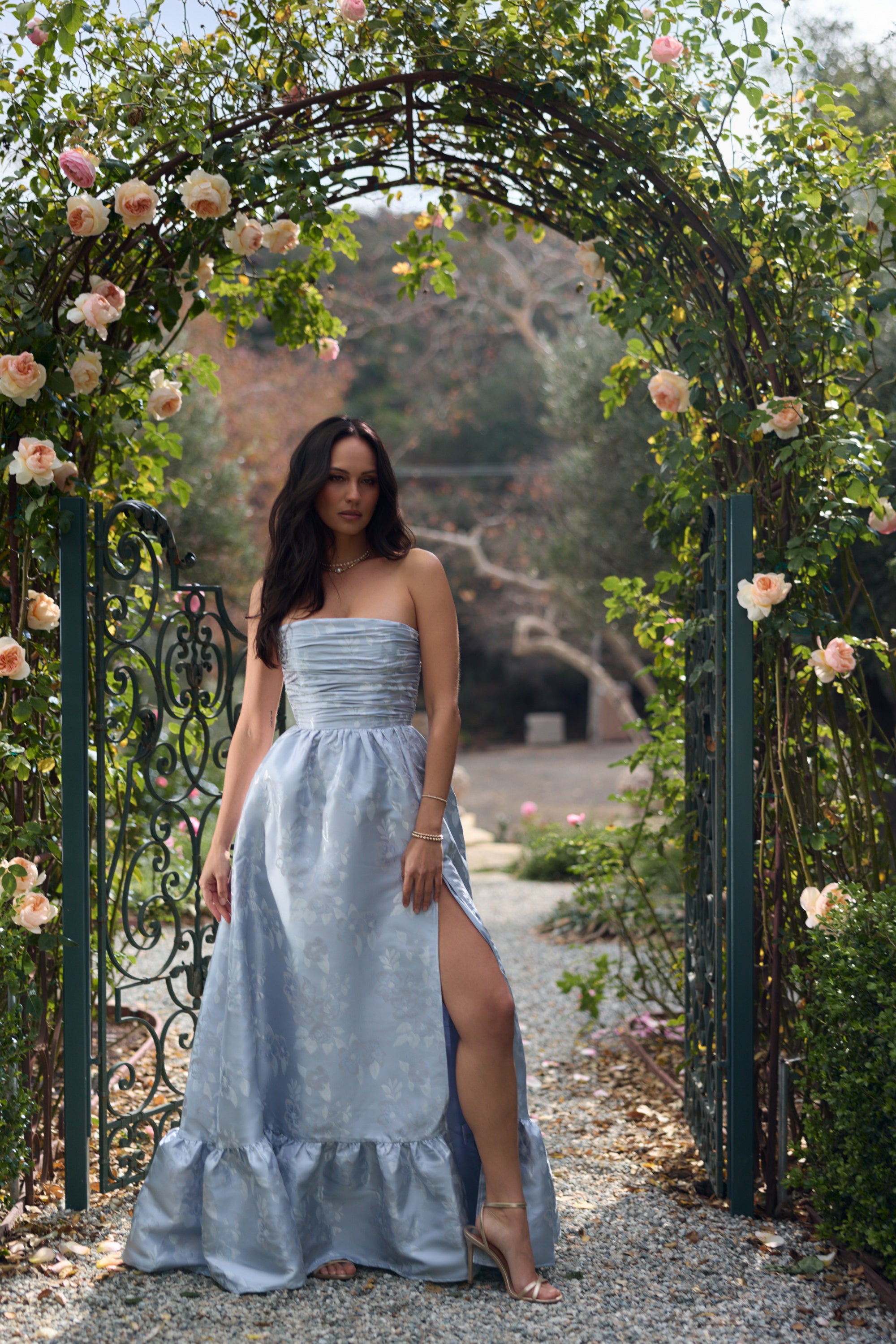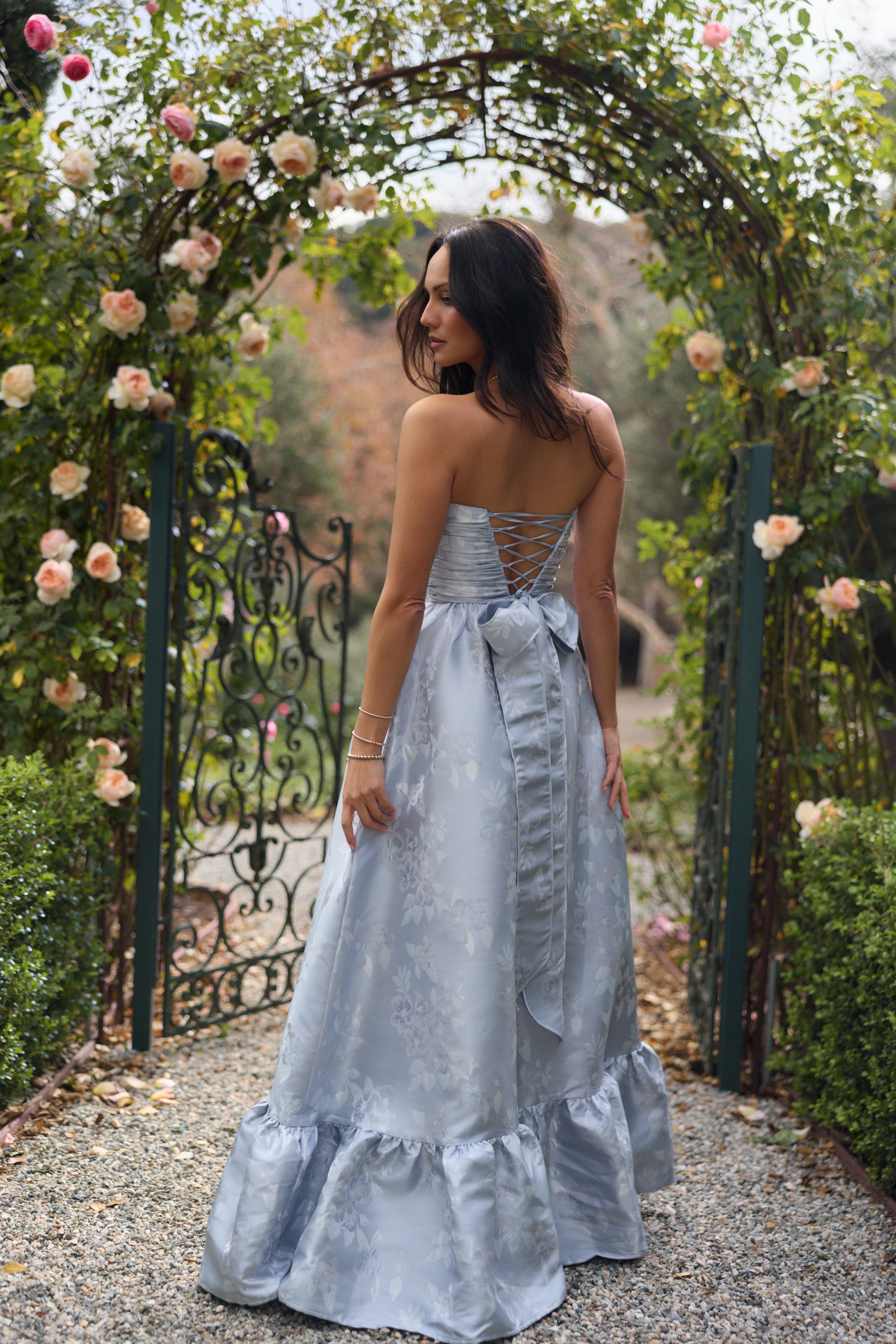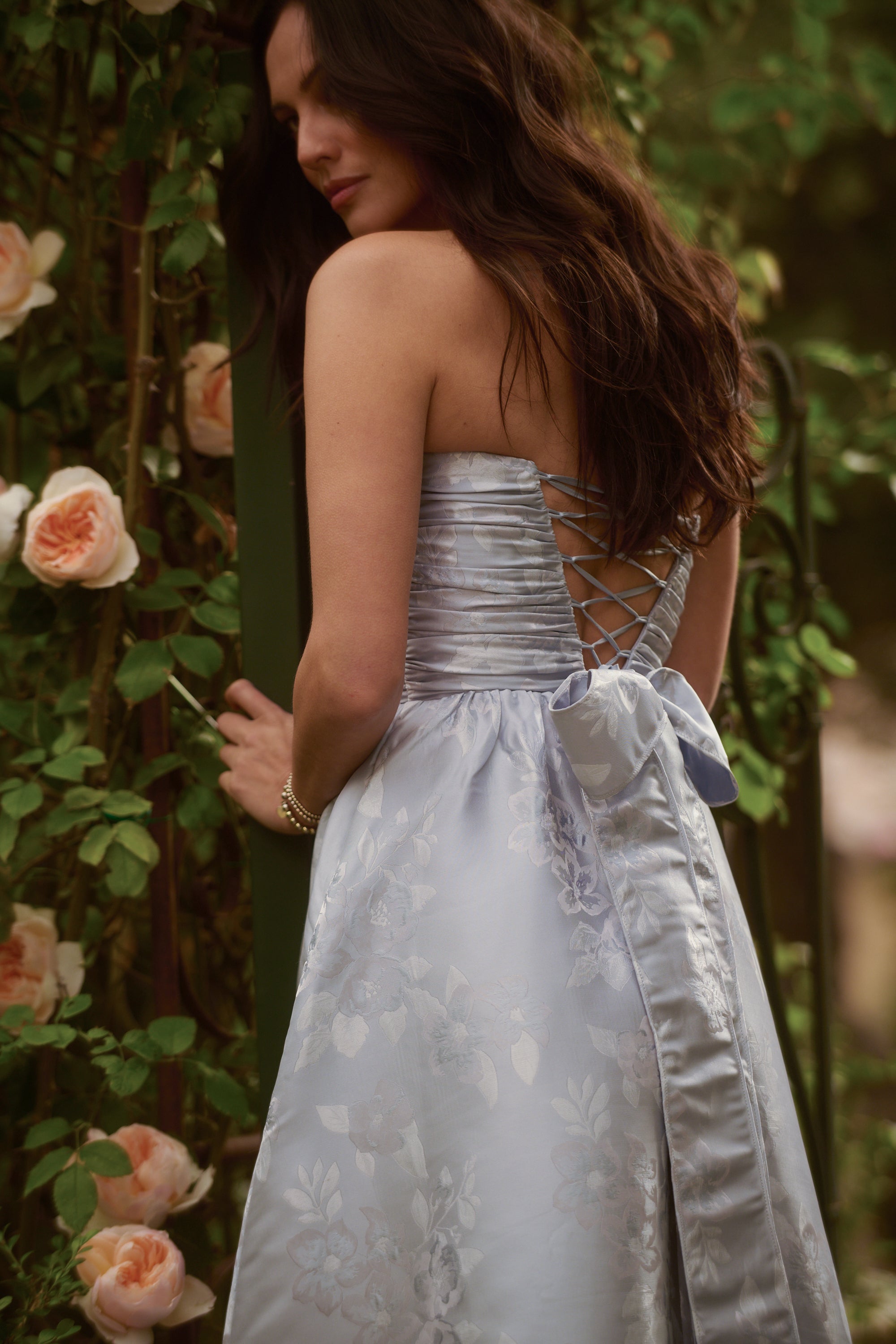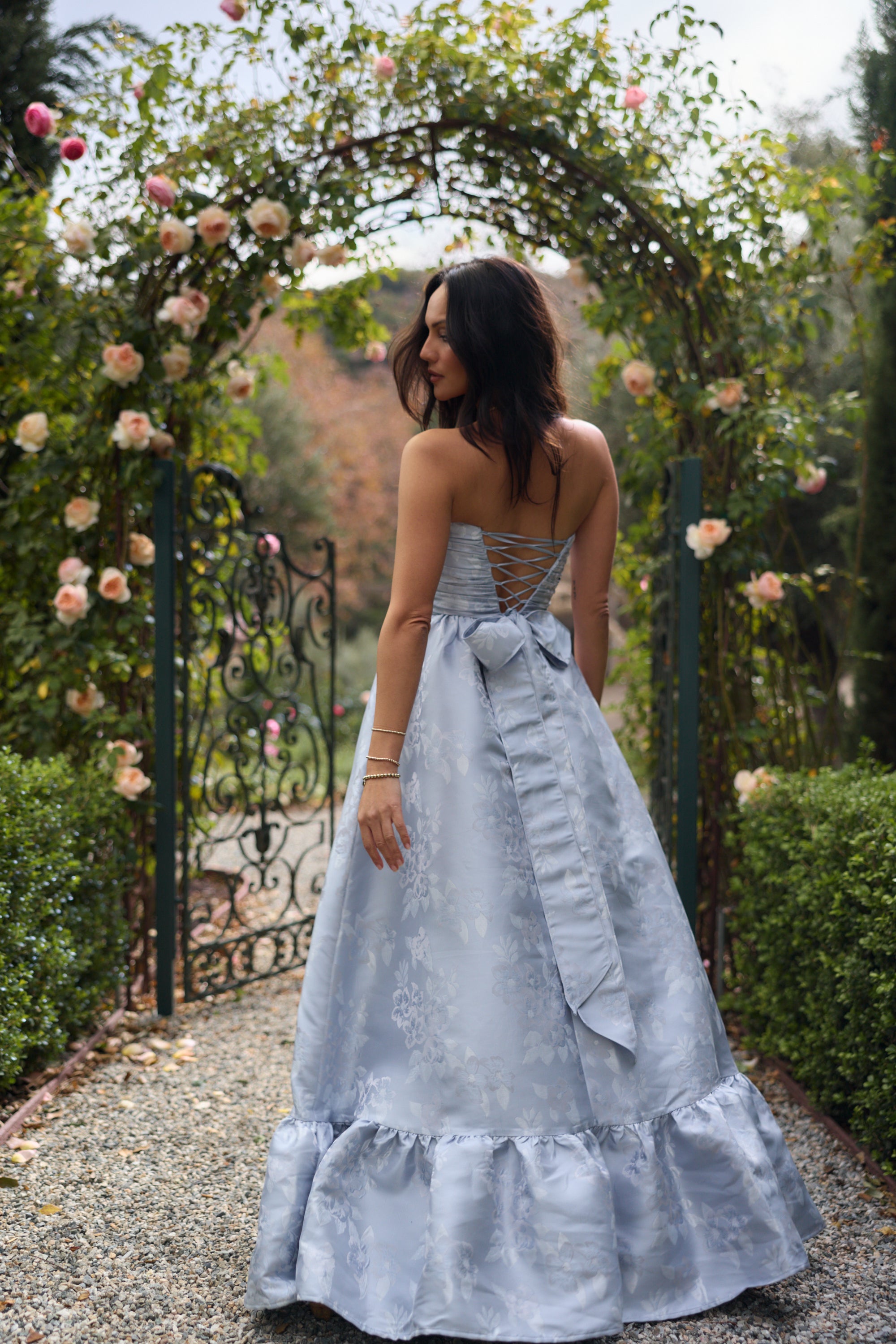 Meet Regina, the perfect strapless gown featuring all things classy and elegant. She's made from our romantic Icelandic Blue Baroque, which features tonal florals on a soft tonal blue floral brocade background. Fall in love with her gathered corset bodice, gathered tier skirt, and lace-up closure. Dance the night away in this brocade dream.