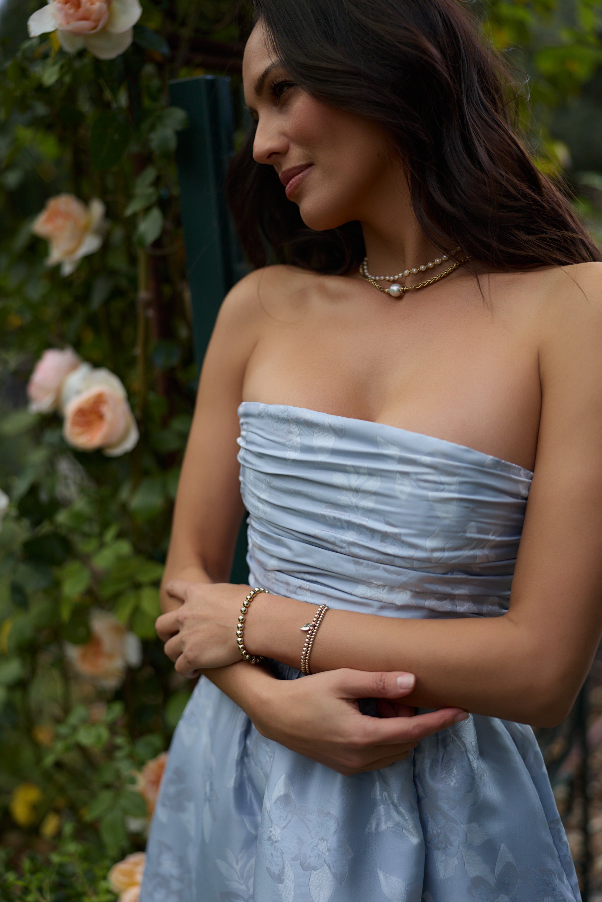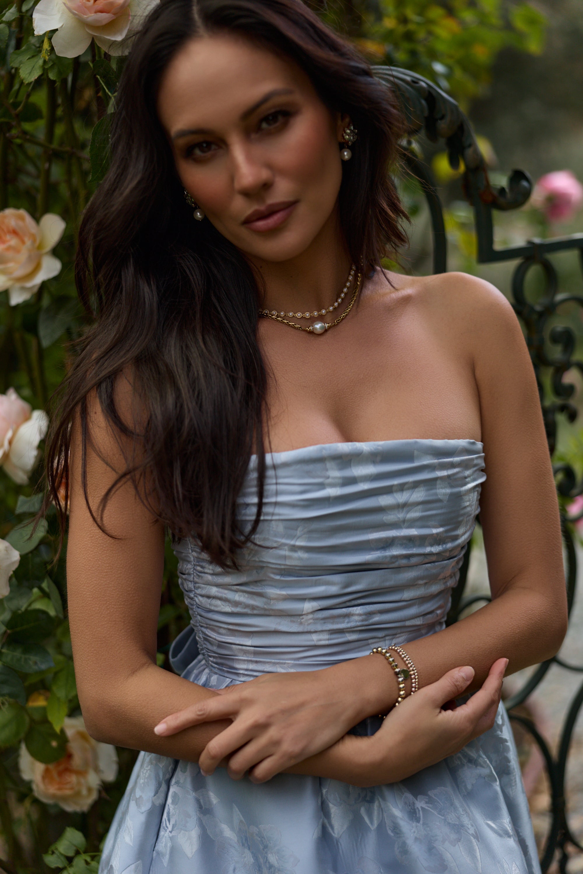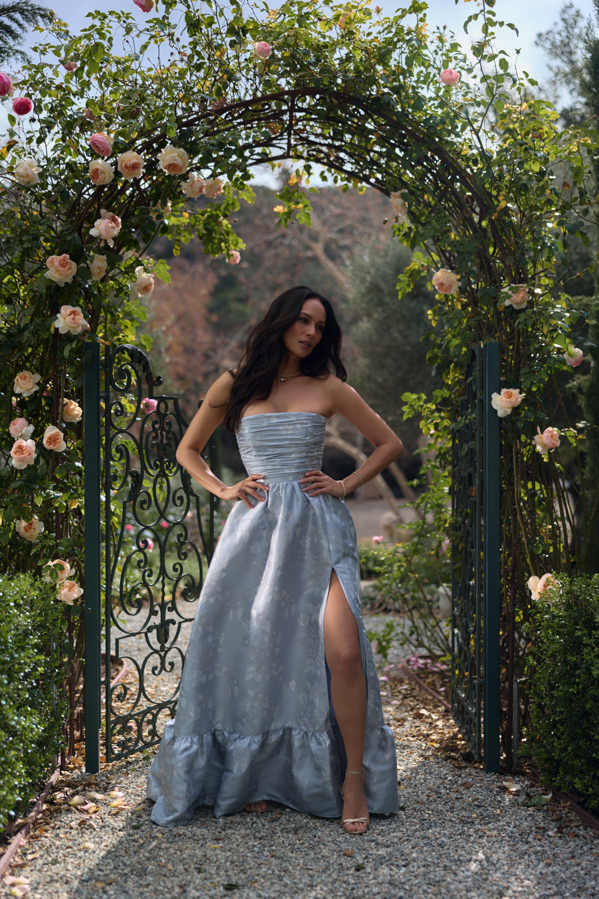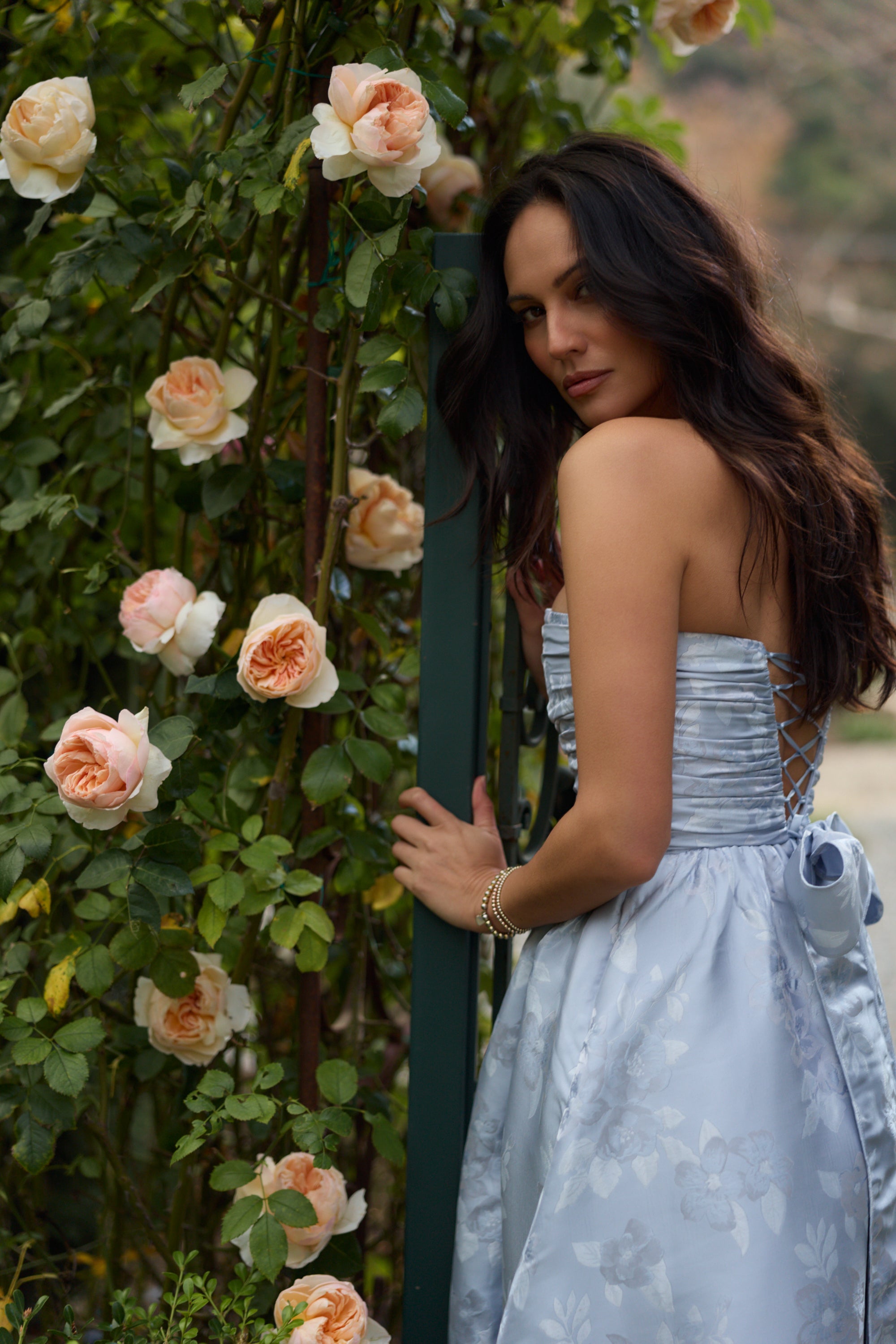 Meet Regina, the perfect strapless gown featuring all things classy and elegant. She's made from our romantic Icelandic Blue Baroque, which features tonal florals on a soft tonal blue floral brocade background. Fall in love with her gathered corset bodice, gathered tier skirt, and lace-up closure. Dance the night away in this brocade dream.
