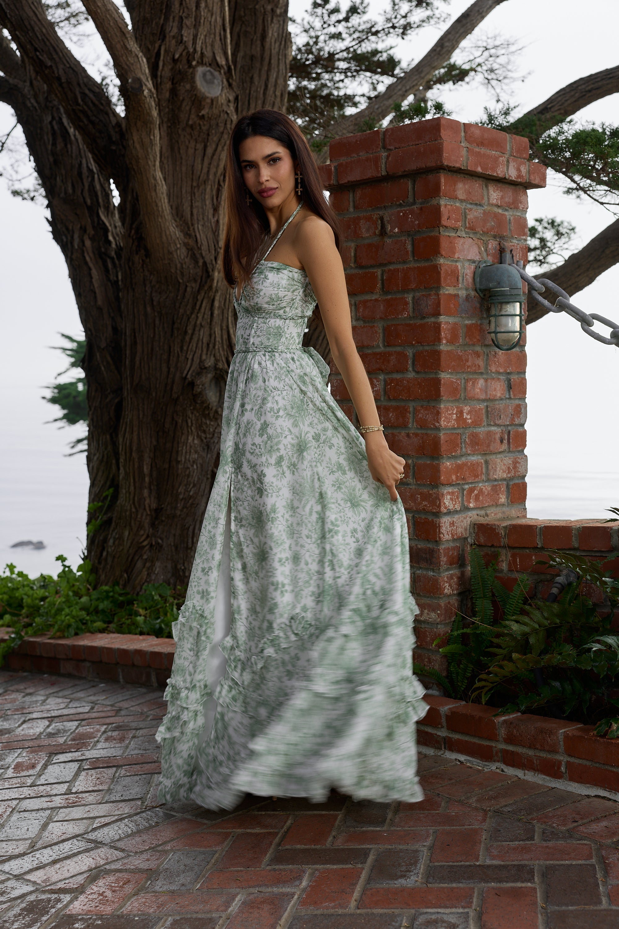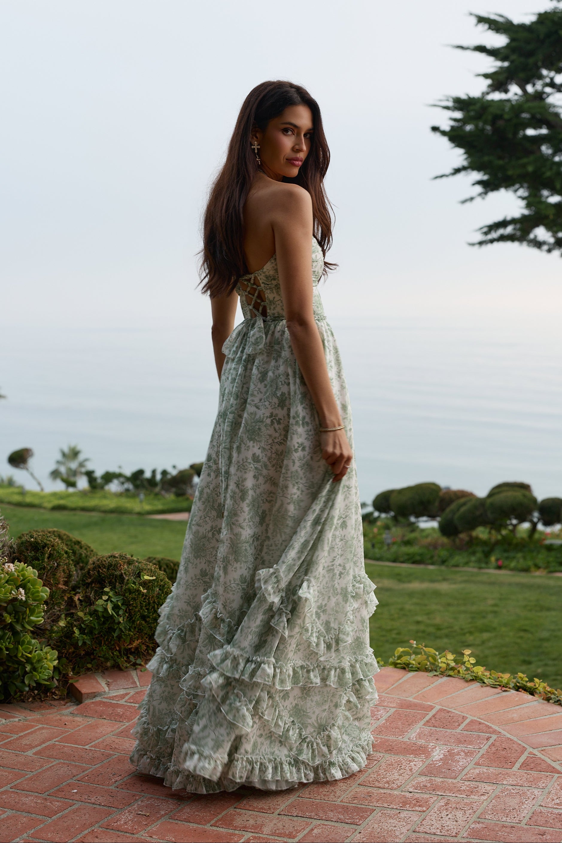 Introducing The Scarlette Dress! She's a stunning halter corset gown accented with braided trim. She flaunts a beautifully gathered skirt, gathered bust, and is made in our Sage Toile textured organza, which features sage florals on a soft-white background. Finished with dreamy ruffle details, side-front slit, and laced corset back, she'll surely turn heads.