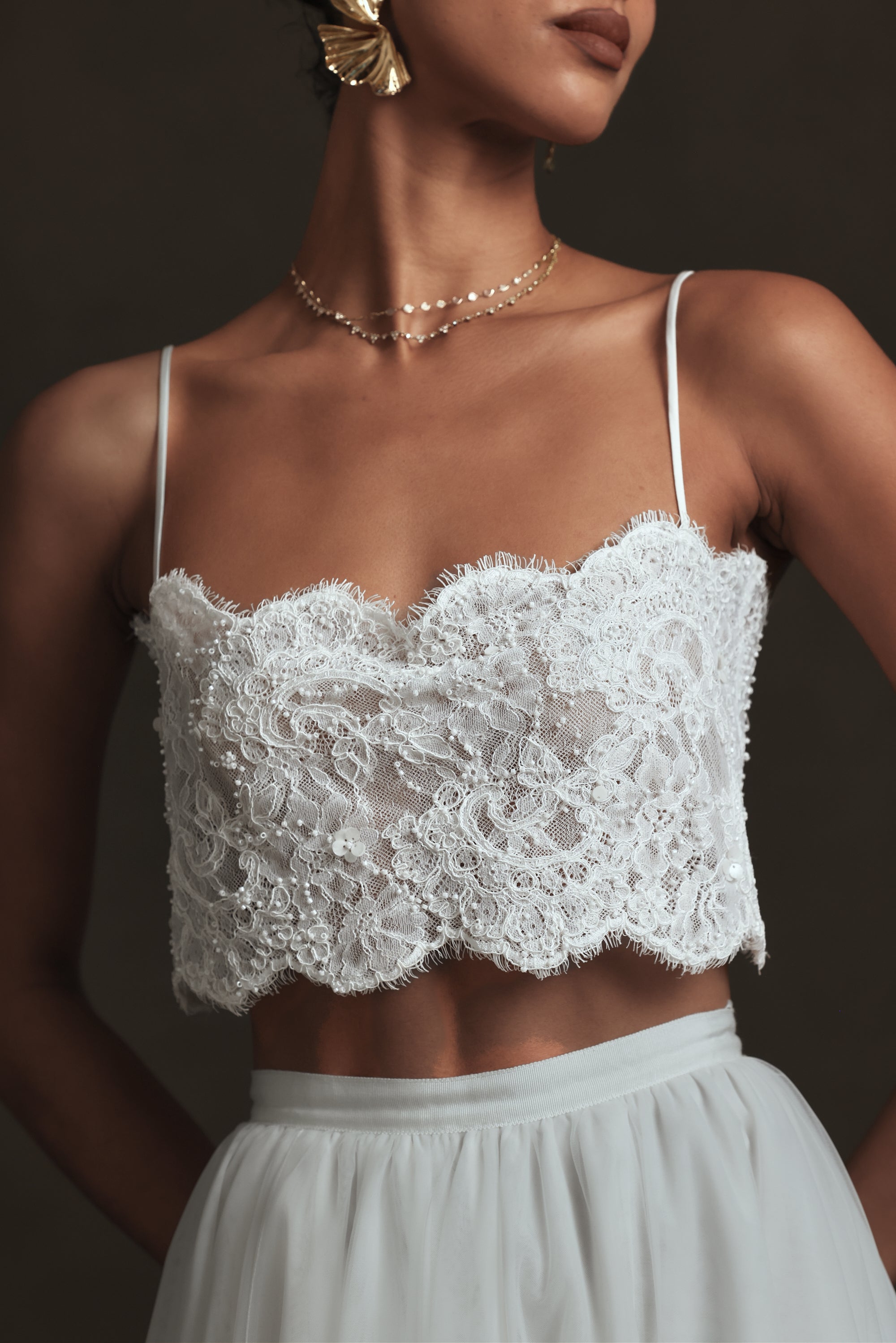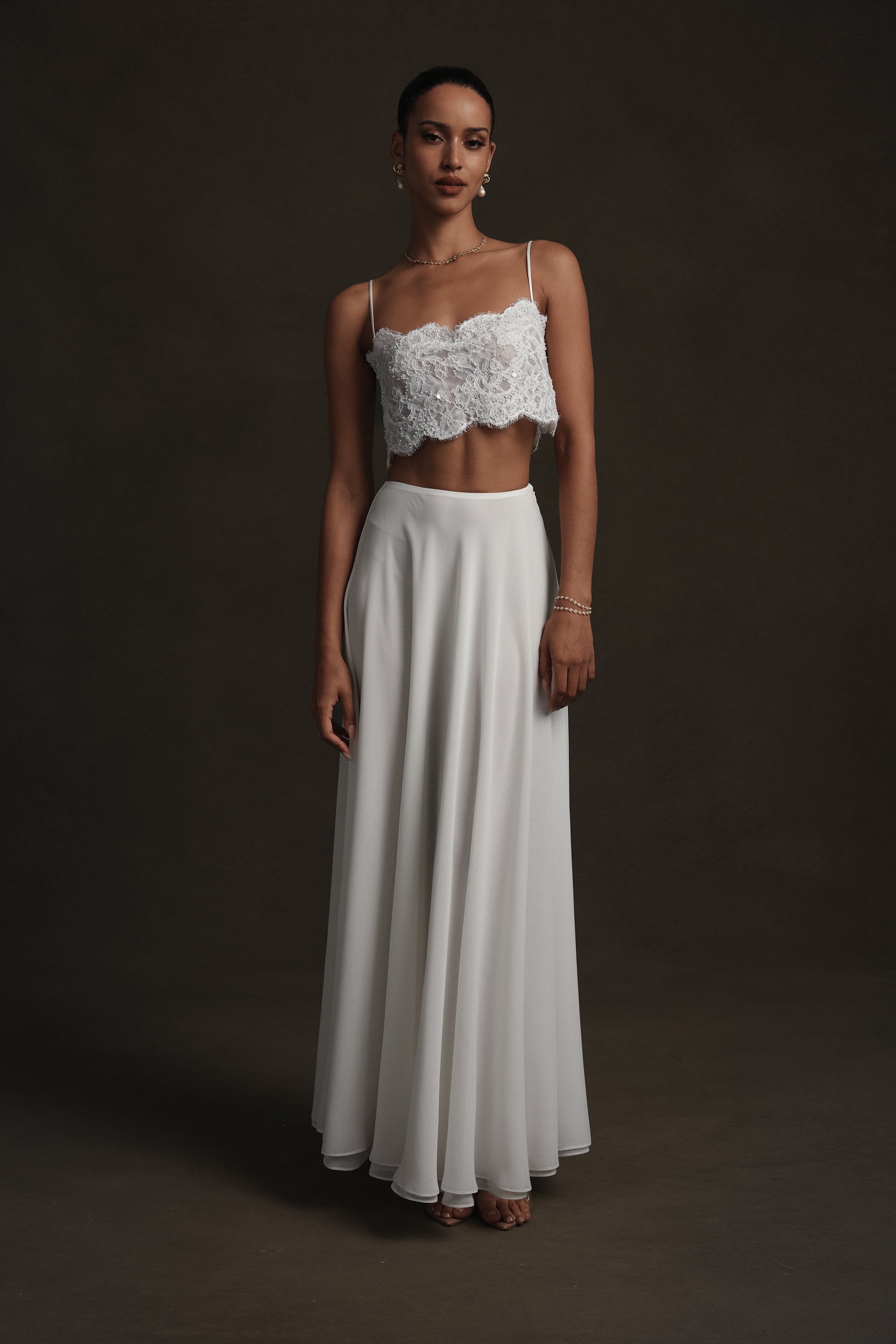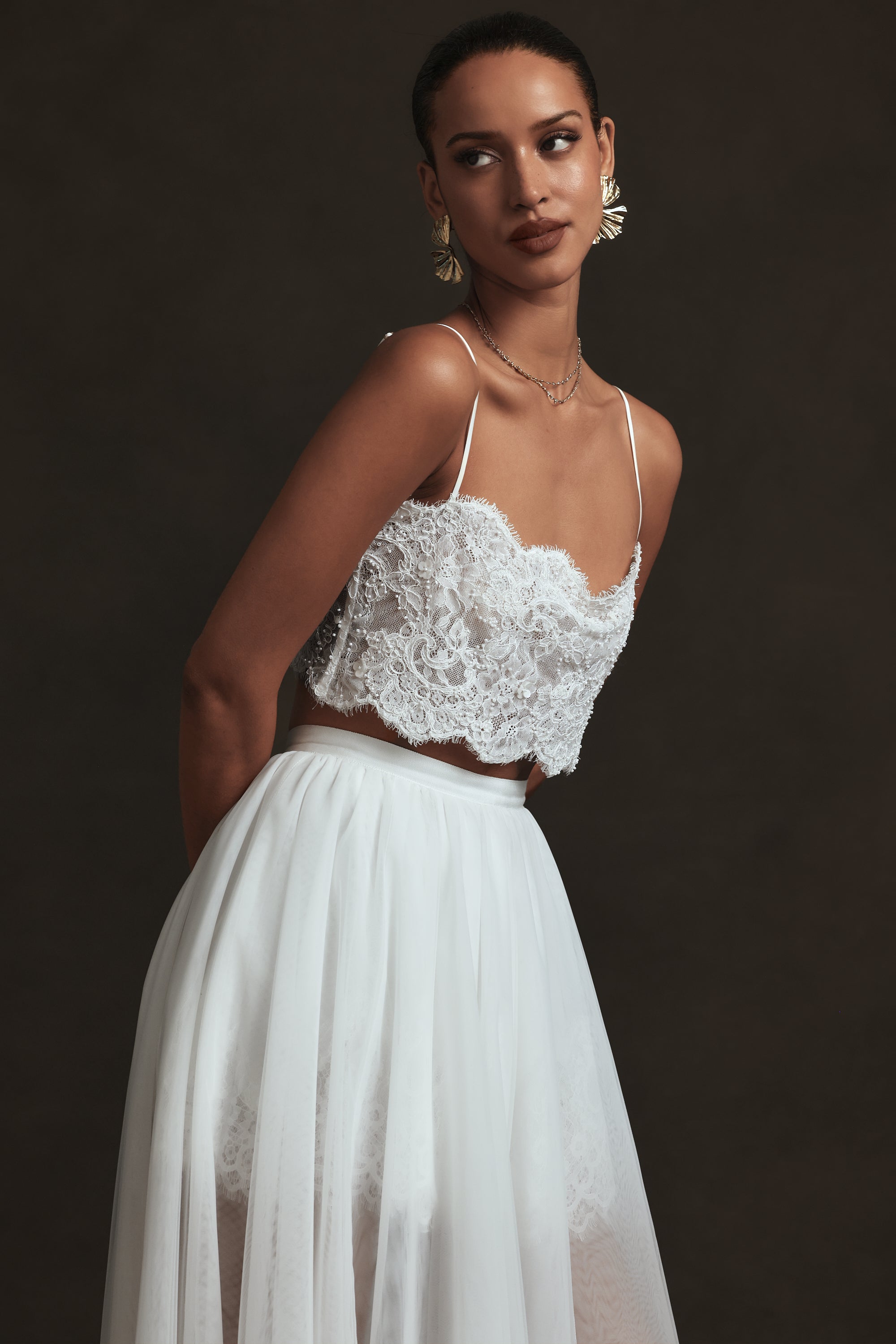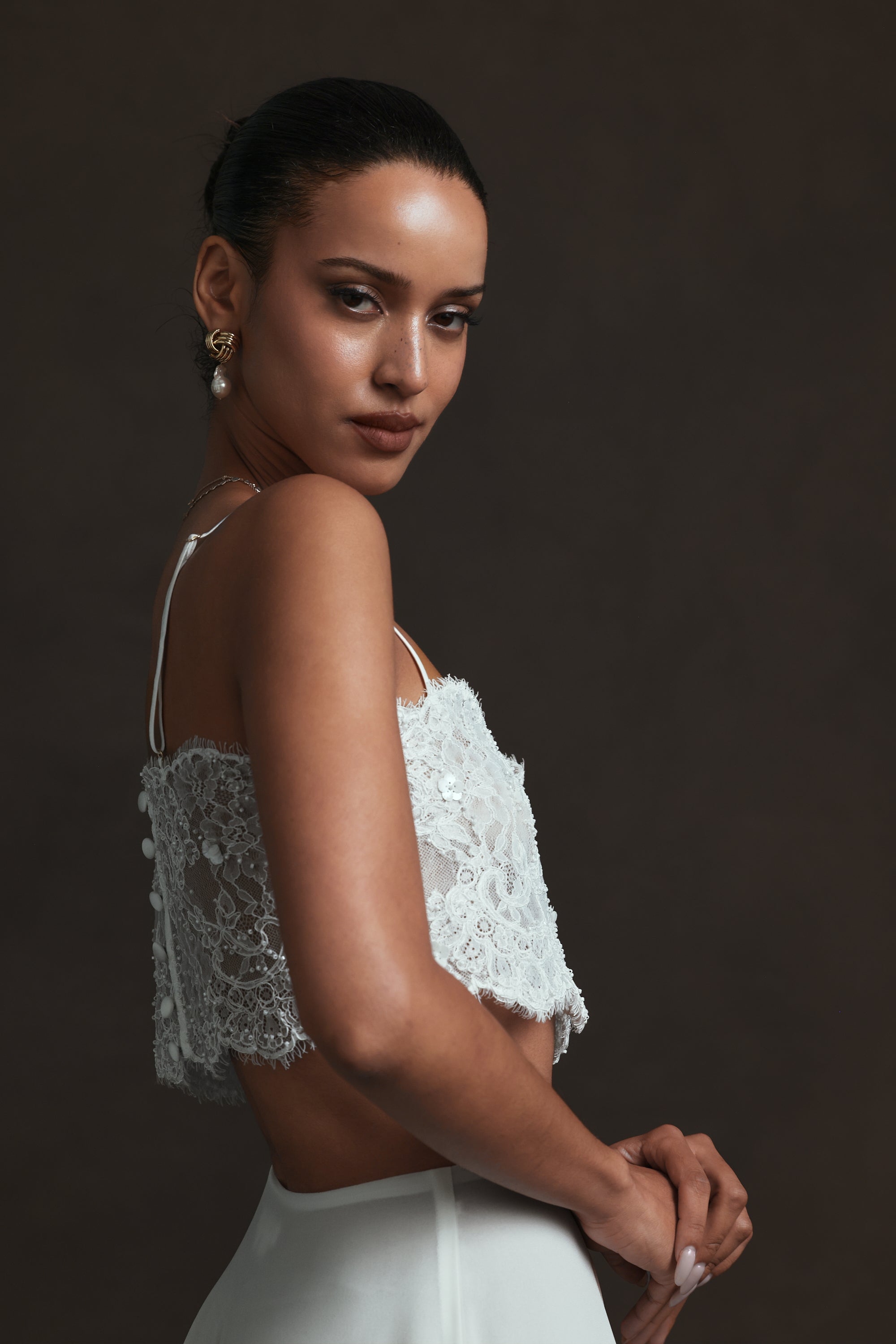 The Shiloh Top is a delicately structured cropped top crafted in sheer white lace, adorned with subtle beading that catches the light. Designed with slender straps and a softly scalloped neckline, it offers a romantic yet modern feel. Satin-covered buttons line the back for an elegant finish, adding a touch of vintage-inspired charm. Pair her with The Sable Skirt or The Carter Skirt for an effortless look.