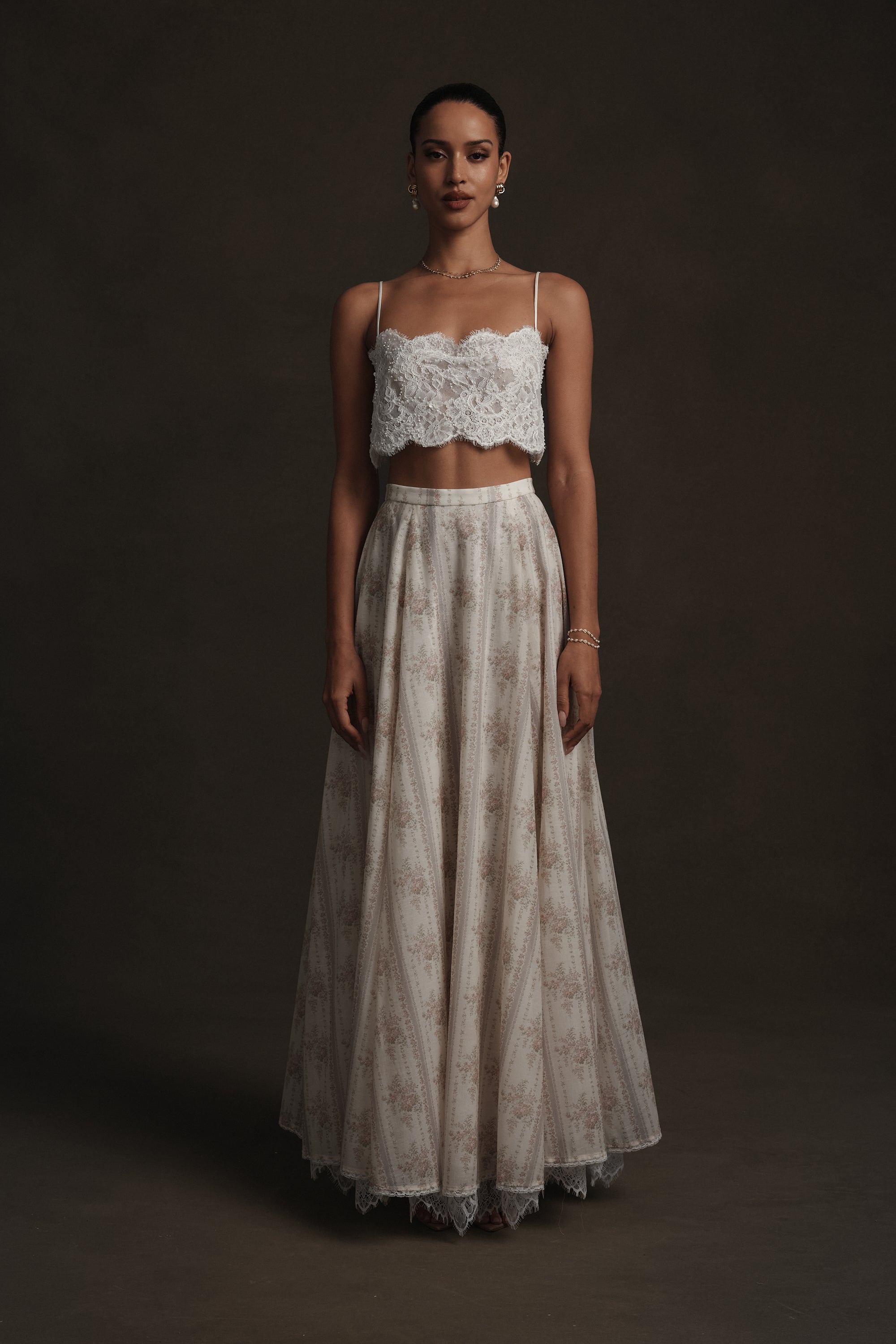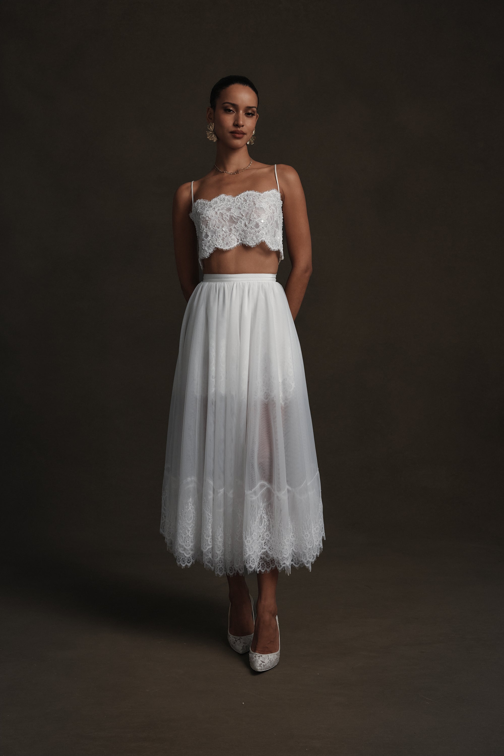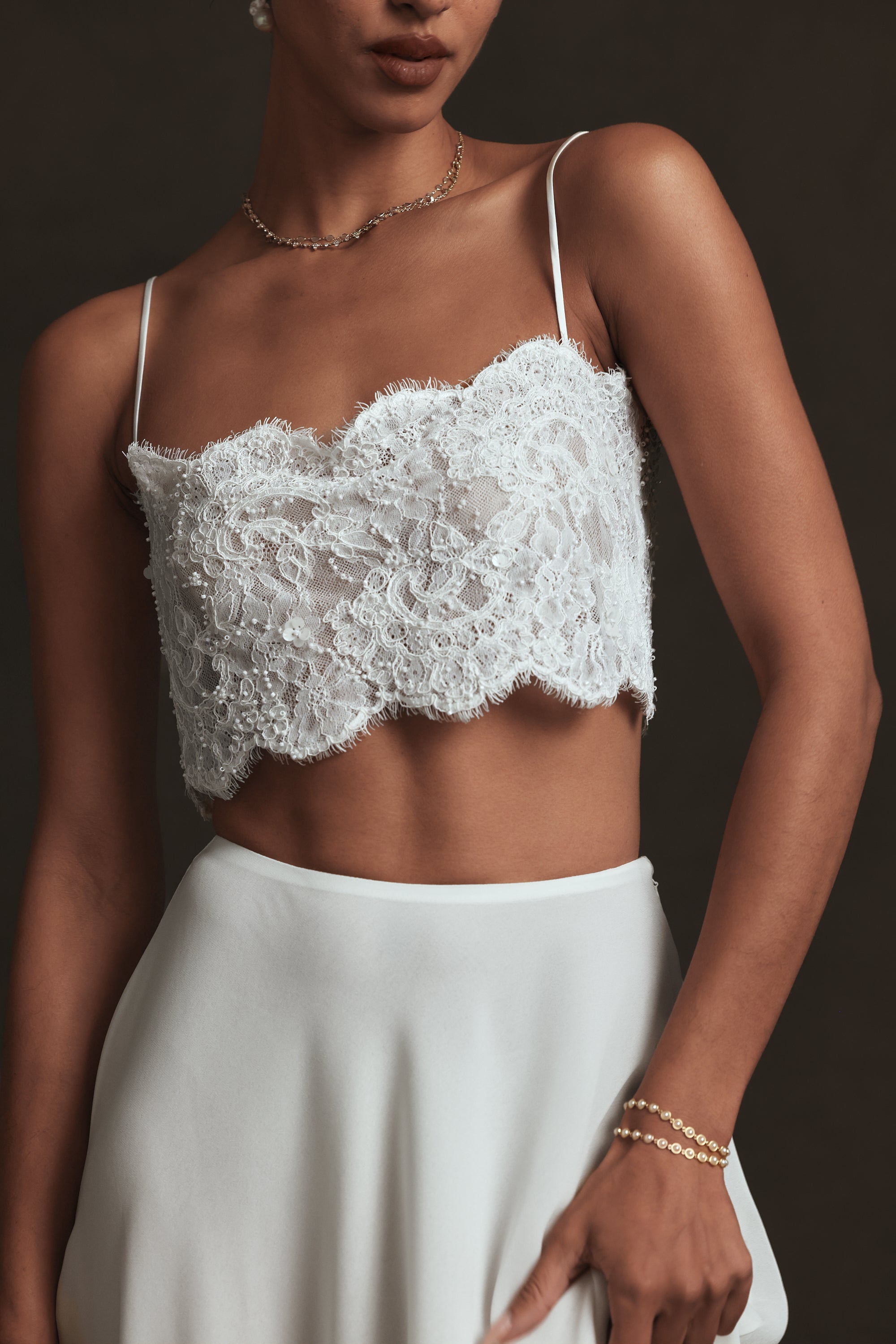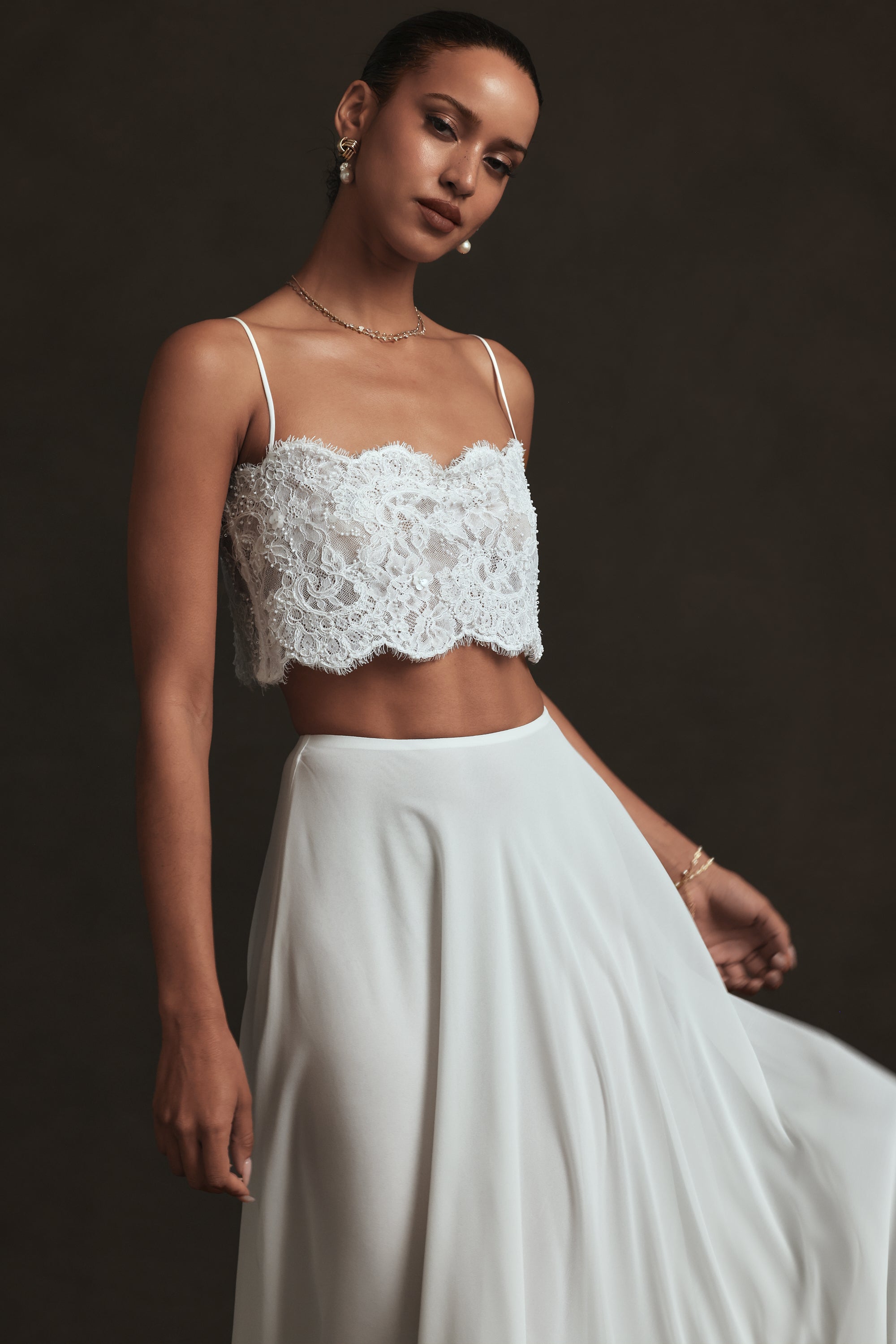 The Shiloh Top is a delicately structured cropped top crafted in sheer white lace, adorned with subtle beading that catches the light. Designed with slender straps and a softly scalloped neckline, it offers a romantic yet modern feel. Satin-covered buttons line the back for an elegant finish, adding a touch of vintage-inspired charm. Pair her with The Sable Skirt or The Carter Skirt for an effortless look.
